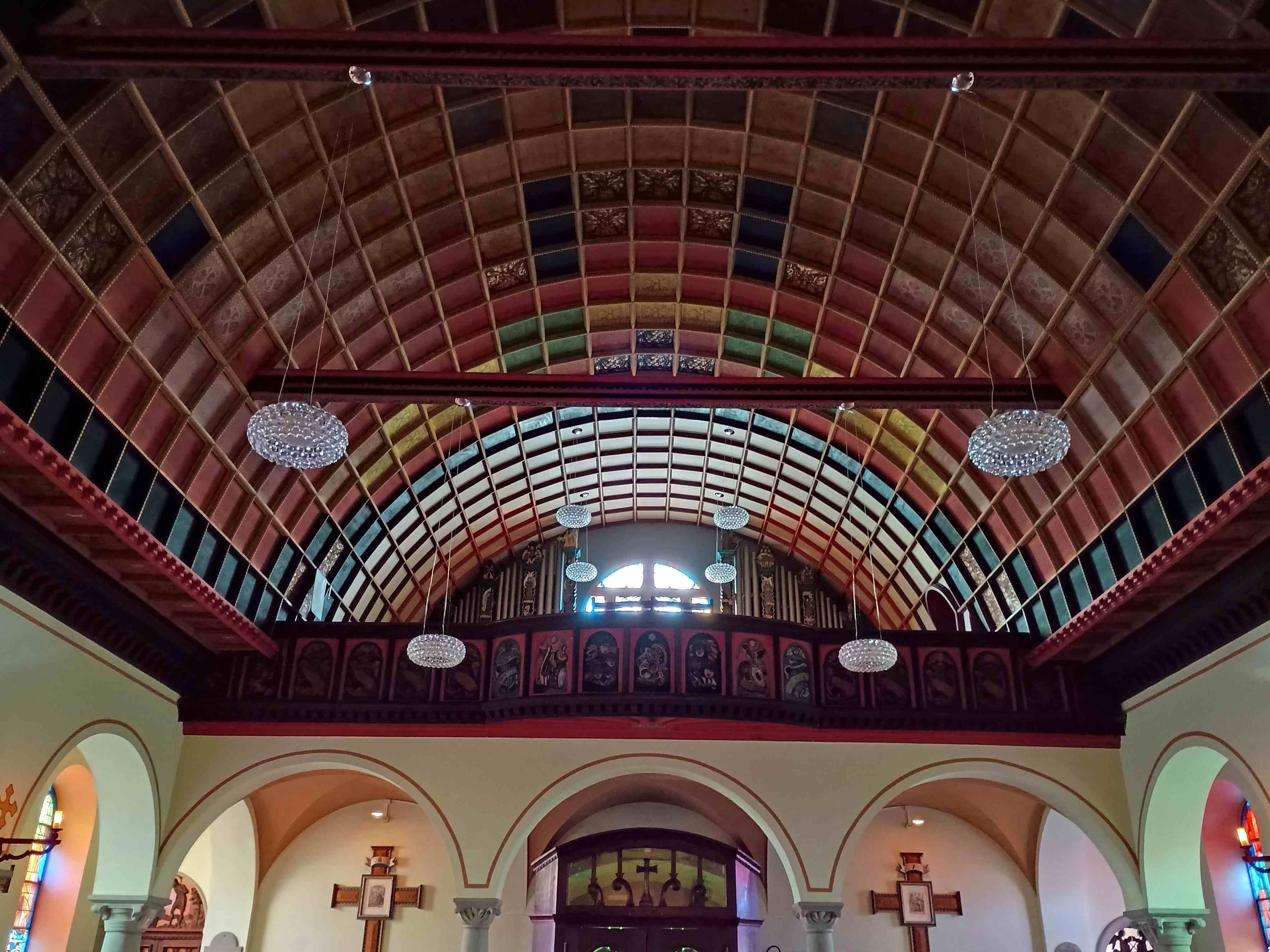 Der Bezug seines Fensters zu Jerusalem wurde übrigens von der Tonnendecke aufgenommen. Einige Kassetten vor dem Fenster sind farbig bemalt, so dass sich hier über der versammelten Gemeinde ein illusionärer Regenbogen von links nach rechts spannt. Solche Raumbezüge sind eine besondere Qualität der Arbeiten Cingrias, für den die Fenster immer Teil der Architektur waren und einem Gesamtkonzept dienen sollten. Damit beschäftigte sich Cingria hier ganz besonders, denn erstmals in seinem Schaffen als Glaskünstler war er in Echarlens für die gesamte Verglasung des Baus verantwortlich. Seine ersten Entwürfe zu dem Rundfenster datieren vom Juni 1924, doch der Einbau erfolgte erst im Dezember zwei Jahre darauf, da finanzielle Schwierigkeiten den Baufortschritt hemmten. Nachdem das Fenster eingesetzt war, wurde es ohne Cingrias Wissen von einem Mitarbeiter der Werkstatt Kirsch und Fleckner farbig bemalt – möglicherweise sind also die kräftigen Farbtöne dieser Arbeit ursprünglich anders gedacht gewesen.
