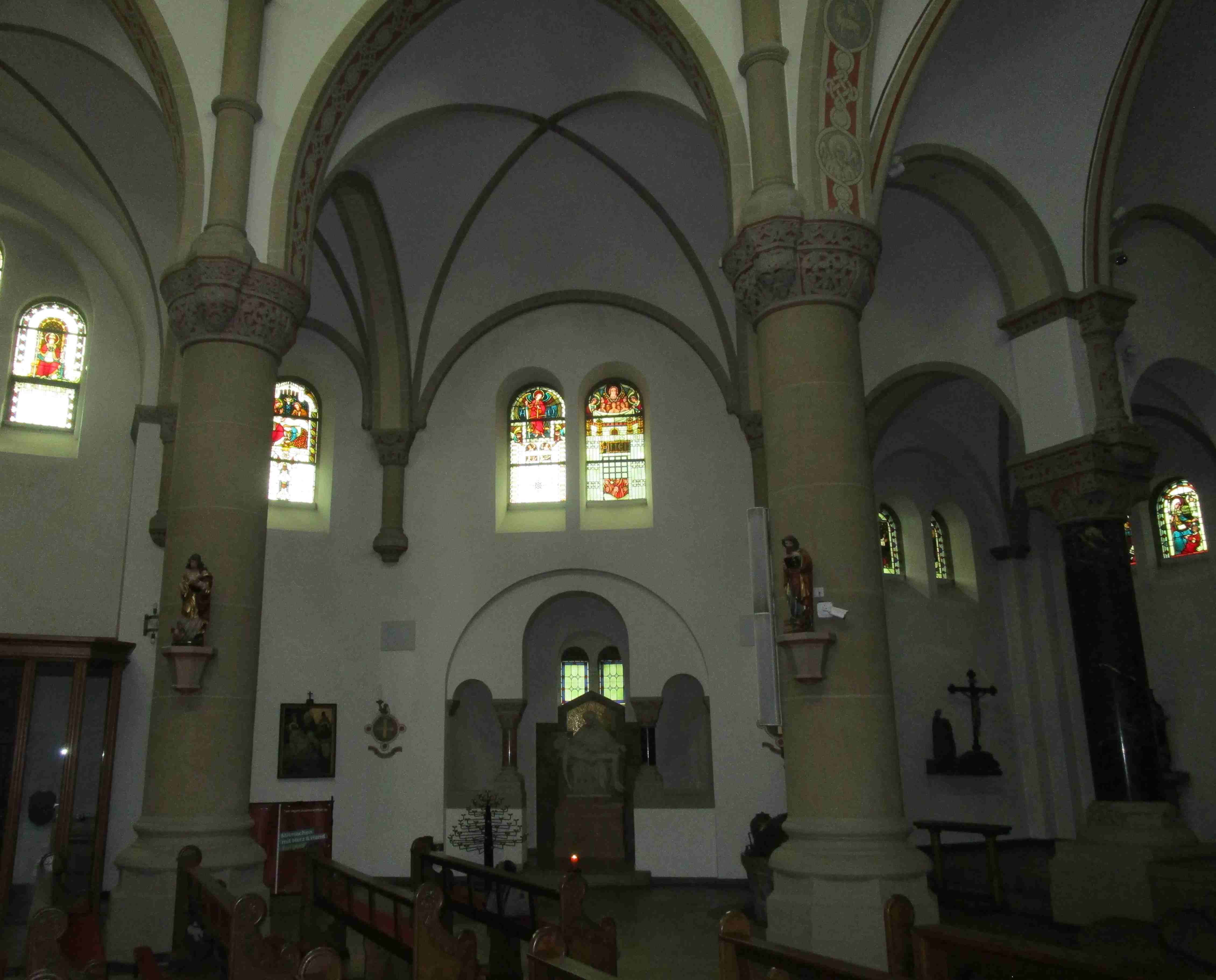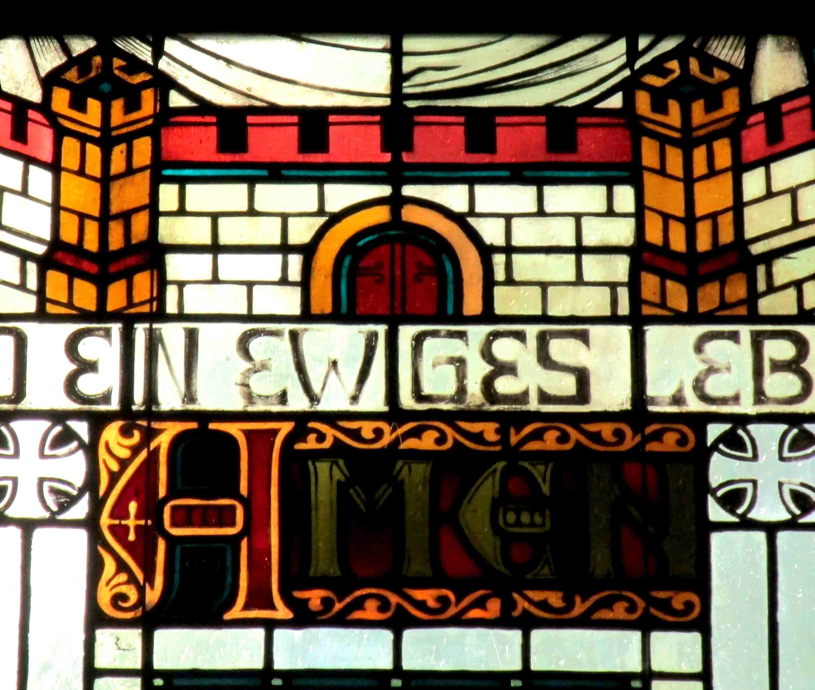 St. Blasius ist die römisch-katholische Hauptkirche in Balve, eine Stadt am Rande des Sauerlands. In den ältesten Teilen geht der Bau an diesem Ort bis ins 12. Jahrhundert zurück, die heutige Erscheinung entstand maßgeblich 1910, als ein Erweiterungsbau nach dem Aachener Dom als dem großen Vorbild des deutschen romanischen Kirchenbaus entstanden ist. Für die Glasmalereien konnte man damals Altmeister Bernhard Kraus (1867-1935) aus Mainz gewinnen, der in der Kaiserzeit Hunderte von katholischen Kirchen und Kapellen mit Fenstern ausstatte, weit über sein Bistum hinaus. Von denen ging leider die Mehrheit im Zweiten Weltkrieg verloren oder wurde in den folgenden Jahren im Purifizierungswahn vernichtet. Glücklicherweise hat sich in Balve ein ganzer Kraus-Zyklus erhalten. Auf zehn Fenstern wird das Glaubensbekenntnis thematisiert, hier das Ende „und ein ewiges Leben. Amen“. Diese Worte finden sich auch auf dem Fenster der Südostseite, als Doppelfenster im Obergarden gegenüber des heutigen Eingangs.