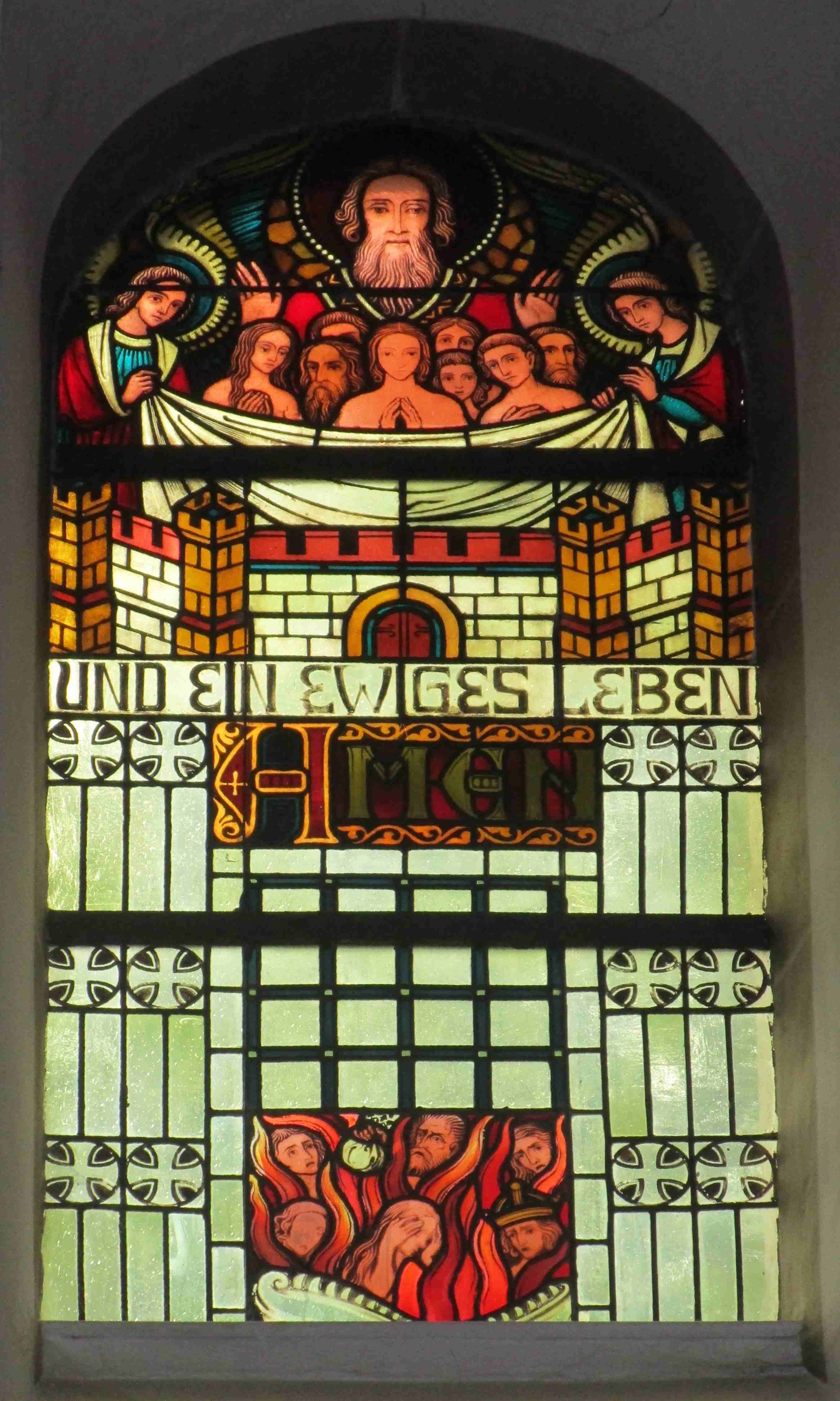 Auch der Gegenort der Unsicherheit ist dargestellt, ganz unten. Dort sperrt ein mittelalterlicher Höllendrachen sein Maul weit auf, um eine Gruppe von Verdammten zu verschlingen. Die Malerei ist noch gänzlich dem Historismus verhaftet, ohne Anklänge an Art Deco oder Jugendstil. Seine besondere Qualität ist auch die ornamentale Musterung: Kraus hat jedes seiner Fenster mit einer anderen Musterung versehen, gelegentlich mit originellen Einfällen: Hier geht die Musterung in ein schmiedeeisernes Gitter über, dass die Hölle vom Himmel abschließt.