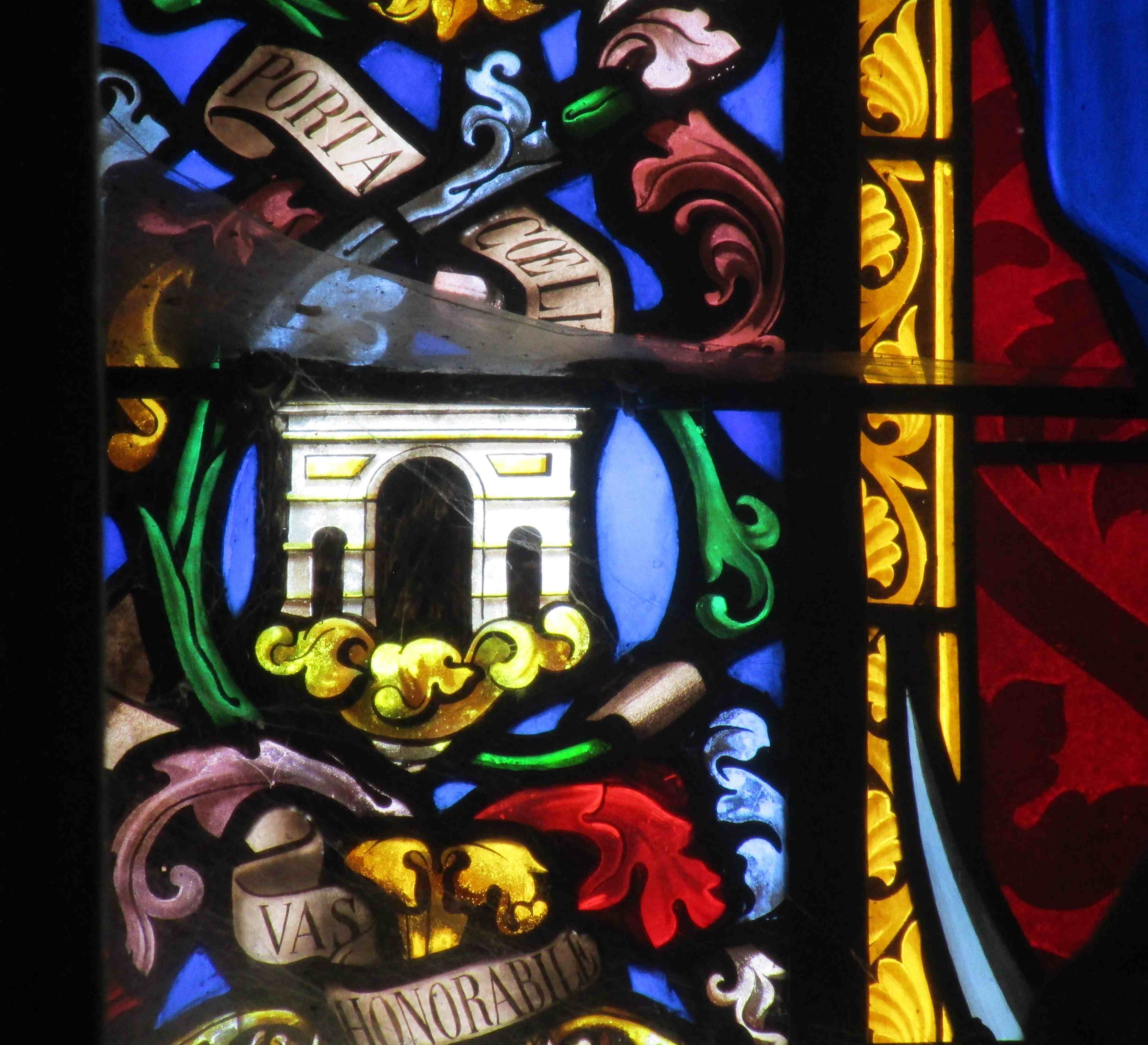 Die exakt zwölf Symbole, die in Artonne die Reinheit Mariens anzeigen, sind in einem Reigen um die Marienfigur gezogen, umwoben von farbigen Girlanden und Spruchbändern. Auf diesen sind die Symbole in Latein genannt, was die korrekte Zuweisung erheblich erleichtert. Links im unteren Bereich ist das zweite Symbol (direkt nach der Vase ganz unten) die Porta Coeli, also die Himmelspforte. Es handelt sich um einen klassizistischen Triumphbogen mit drei Durchgängen, wie der Augustusbogen von Orange oder der kleine Triumphbogen im Pariser Tuilery-Garten. Eine solche Gestaltung war damals populär, siehe auch die Kathédrale in Blois (um 1860), Saint-Jean-Baptiste in Nemours (1864) oder Notre-Dame in Vitré (1870).