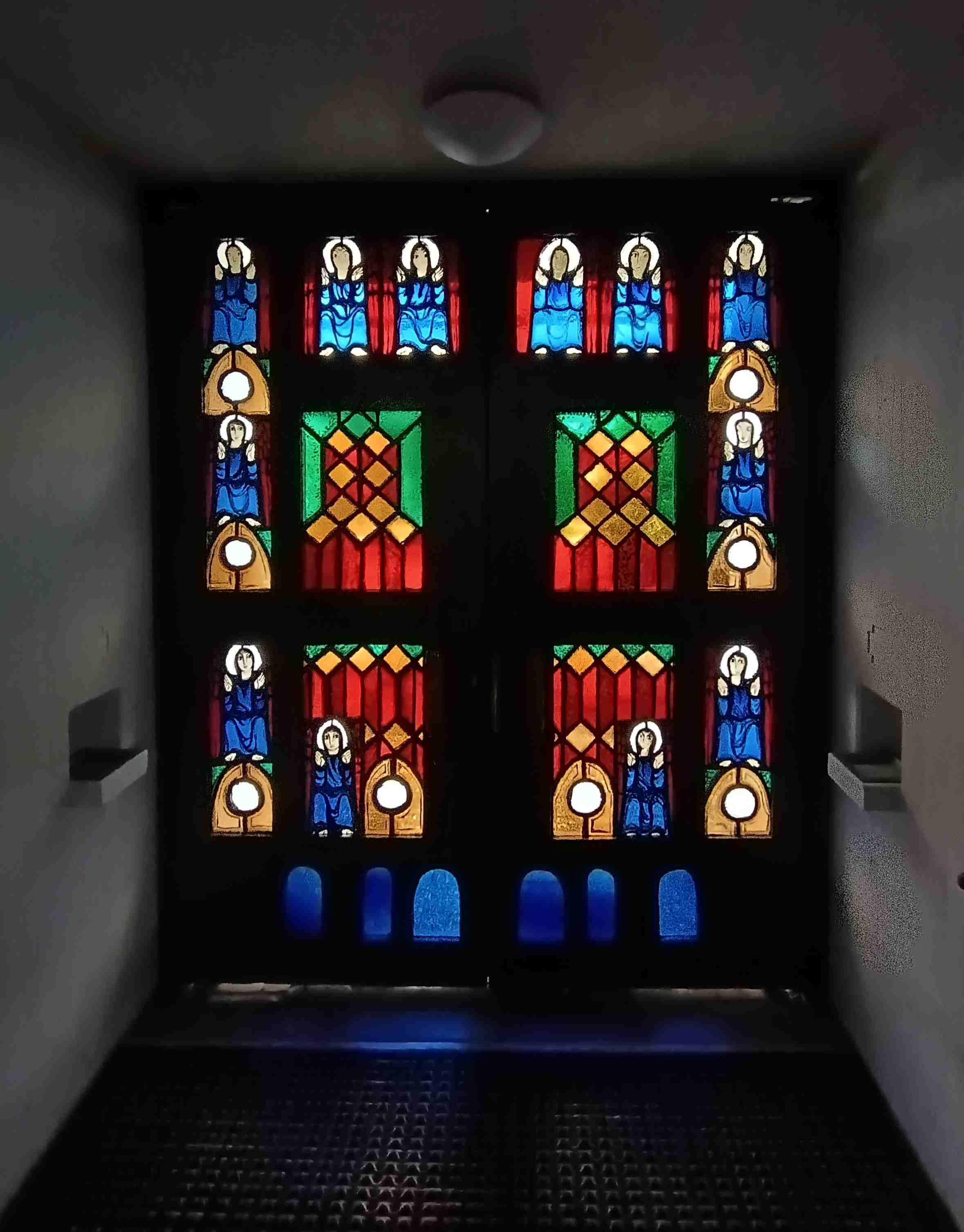 Dort findet man goldfarbige Rundbogentore mit weißen Kreisen in der Mitte, den Perlen der Stadt, womit die Tore zu Perlentoren werden. Auf ihnen steht eine blau gekleidete Figur: die Apostel als Wächter. Drei solcher Tore findet man an der rechten, drei an der linken Seite. Nun wird es schwierig: Wo sind die übrigen Tore? Zwei befinden sich unten, wo nicht mehr genügend Platz war, die Figur auf die Tore zu stellen – daher steht sie neben den Toren. Zusammen macht das acht Tore. Oben sind nochmals vier solche Personen zu finden, jedoch ohne Tore, die offensichtlich vergessen worden sind. Auch an anderer Stelle der Glaswand sind die fehlenden vier Tore nicht zu finden. Platz wäre noch in der benachbarten Tür gewesen, doch dort ist der Lebensbaum Thema.