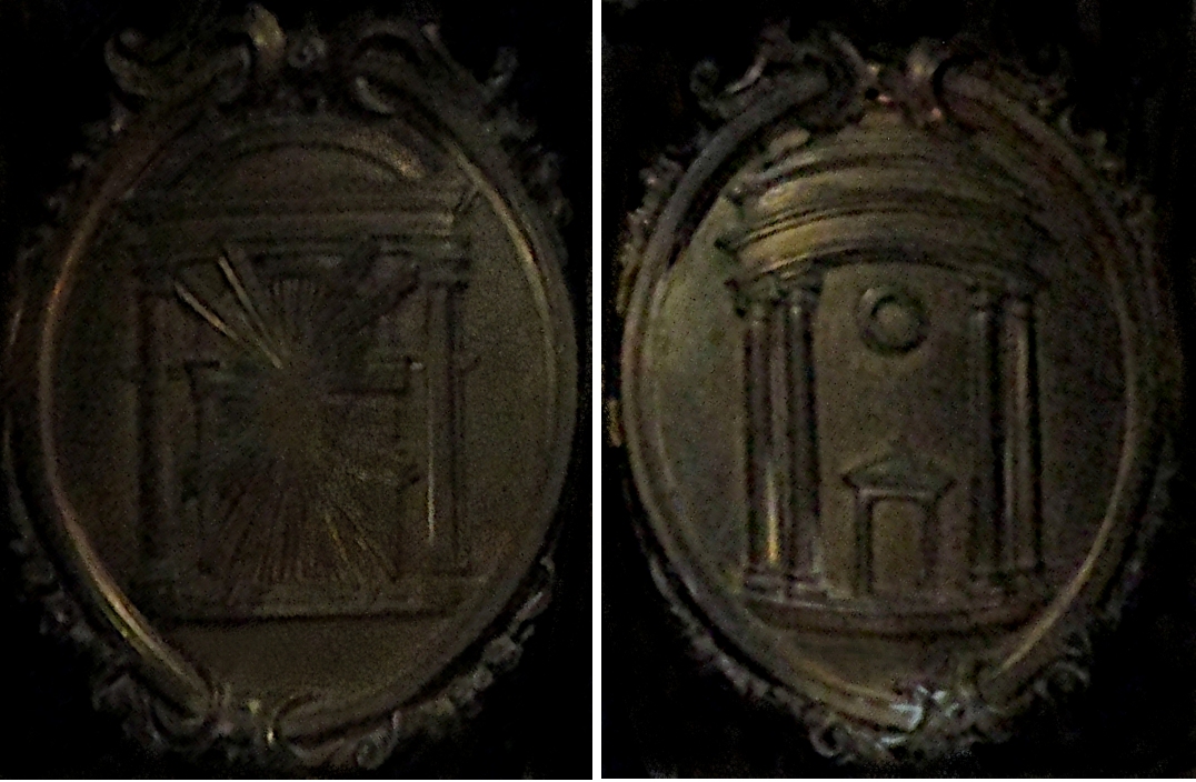 Caffieri schuf sechs Medaillons, die ebenfalls Symbole Mariens nach der Lauretanischen Litanei zeigen. Hier ist das Himmlische Jerusalem prominent vertreten, die beiden obersten Medaillons zeigen beide jeweils eine Pforte der Stadt. Die linke, im Original leicht gedreht, zeigt eine mächtige Sonne, die die Öffnung der gesamten Pforte besetzt. Ihre Strahlen verdecken fast vollständig die innere Pforte mit einem Rundbogen, die in eine größere Pforte mit einem Segmentgiebel gesetzt ist. Das Motiv der Doppelpforte findet sich auch rechts. Dort steht eine winzige Pforte in einem tempelartigen Bau, mit ionischen Doppelsäulen und einem opulenten, mehrstufigen Gebälk.