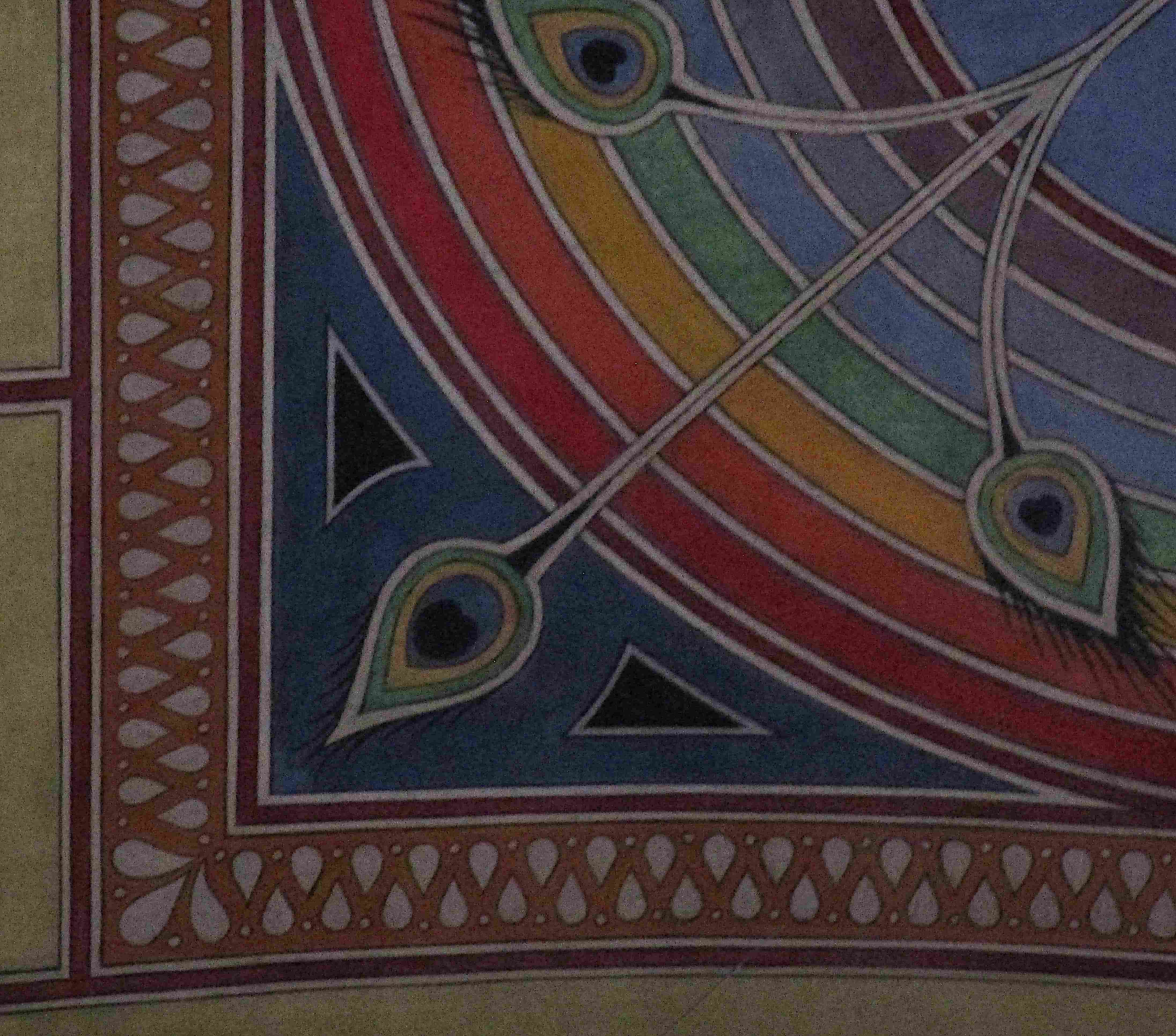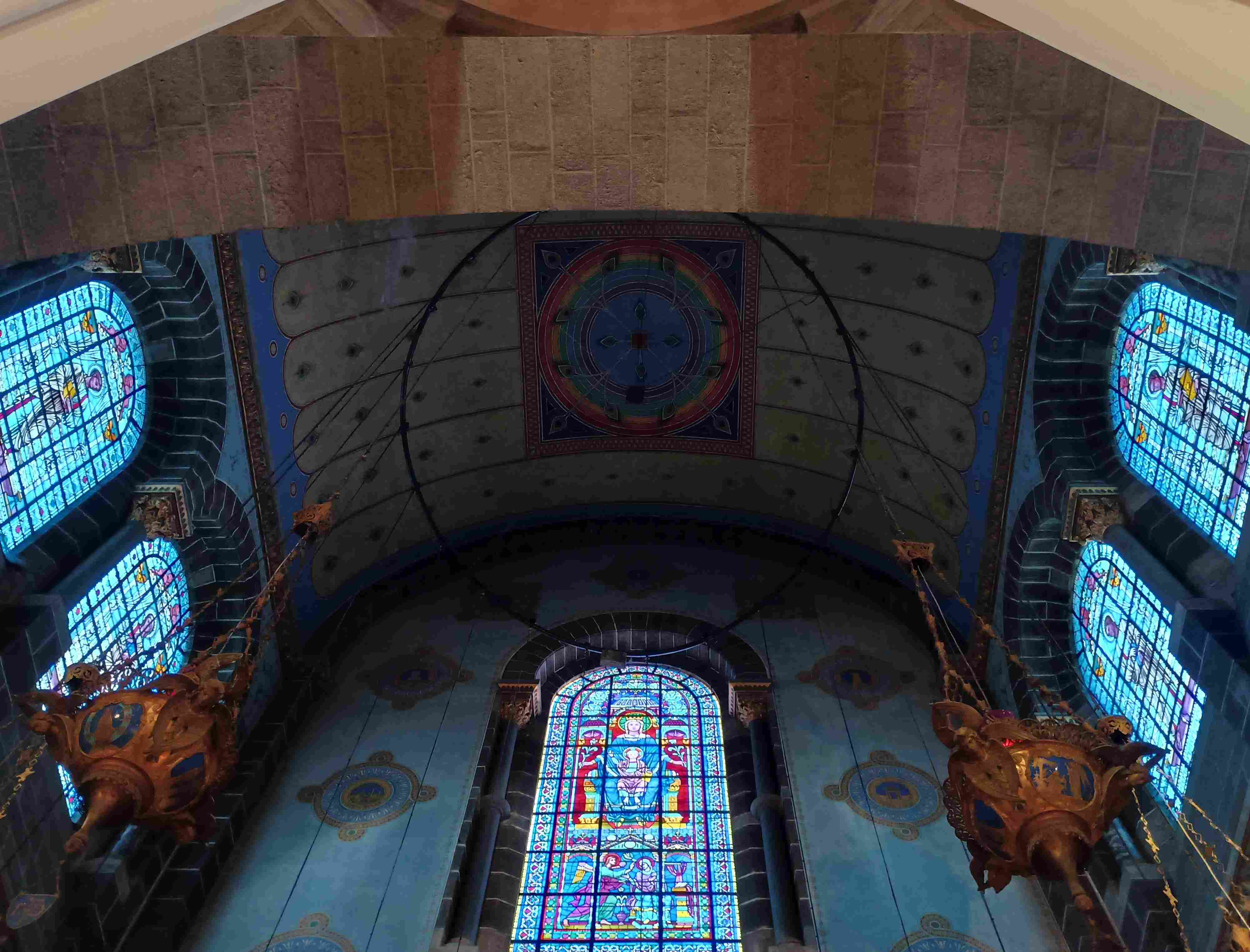 Für das Thema des Neuen Jerusalem sind an erster Stelle die Deckenmalereien der oberen Zone relevant. In der Mitte des 19. Jahrhunderts war in Frankreich die sog. „Schablonenmalerei“ beliebt, auf Französisch „au pochoir“. Mit Hilfe von Kartons und speziellen Pappen wurden Ornamente und Muster vor allem in bürgerlichen Wohnungen an die Wände und Decken aufgemalt. Es gibt aber auch Beispiele aus dem sakralen Bereich, wie hier in Puy-en-Velay. Die Malerei steht in Farbwahl und in Darstellungsform jenseits jeglicher Tradition, in Details wird bereits der vegetabile Jugendstil vorweggenommen. Der Meister, der diese ungewöhnliche Malerei ausführte, ist leider namentlich nicht bekannt, Fachleute vor Ort datieren sie auf die Mitte des 19. Jahrhunderts.