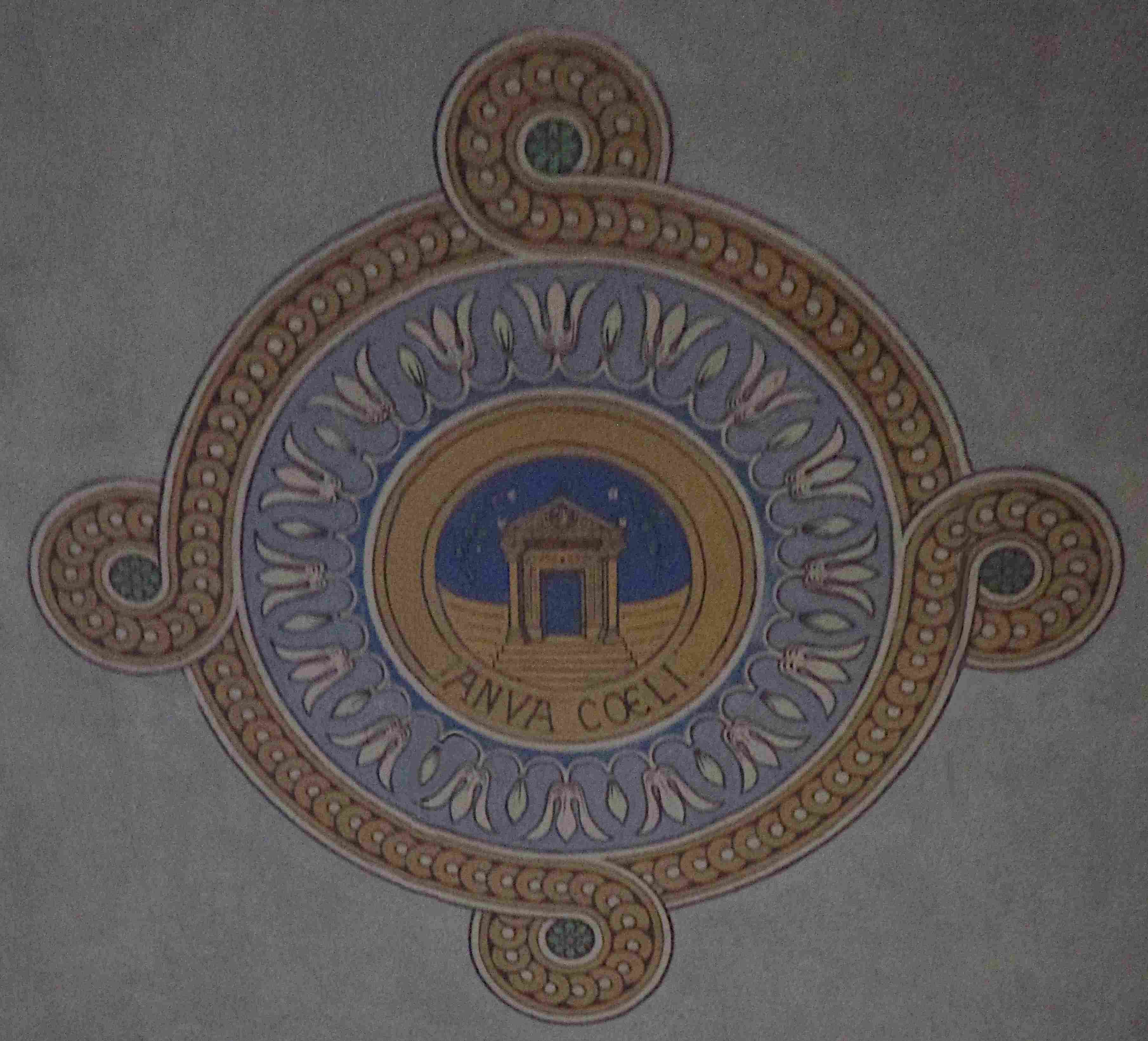 Auf der frontalen Wandseite unter dieser Malerei finden sich neun Medaillons, die ausgewählte Symbole Mariens präsentieren, wie die Federis Arca oder den Sedes Sapientia. Das im Uhrzeigersinn vierte Symbol zur Ianva Coeli zeigt eine klassizistische Pforte, die offen steht.