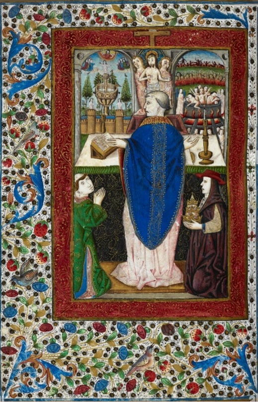 Die Handschrift enthält vor allem Darstellungen von Seelen im Purgatorium. Fol. 86v zeigt den Heiligen und Papst Georg, wie er dabei ist, eine Messe zu halten, assistiert von eine Mönch und einem Kardinal als Messdienern, von denen einer rechts die Tiara hält. Dieses Bild ist eingebettet in ein üppiges florales Rankenwerk, in dem mehrere Tiere versteckt sind. Das Bild mit der Messe zeigt vor dem Altartisch jedoch auch ein Weltgericht. In der Mitte erscheint der auferstandene Christus, der auf seine Passionswunde deutet. Rechts werden ganze Menschenmassen in der Verdammnis gezeigt, darunter auch spektakulär ein gewaltiger Menschen-Kochtopf. Dem gegenüber ist eine Szene himmlischen Friedens gesetzt. Unten zieht sich eine massive Mauer mit Türmen, Vor- und Rücksprüngen entlang. Über der Mauer erhebt sich ein fantasiereicher Brunnen, umgeben von Bäumen, auf denen wiederum Vögel sitzen. Die Andeutung an den ewigen Tierfrieden wie auch an den Paradiesgarten, der bereits im Rankenwerk anklingt, ist auch hier präsent. Belebt wird die Szene durch drei weiß gekleidete Menschen, die auf den Türmen und dem Brunnen stehen. Weitere Heilige, diesmal farbig gekleidet, finden sich in Gruppen darüber zusammen, wo sich der Himmel öffnet und Gott erscheint, ähnlich wie auf MS 1, MS 2 oder MS 9014.