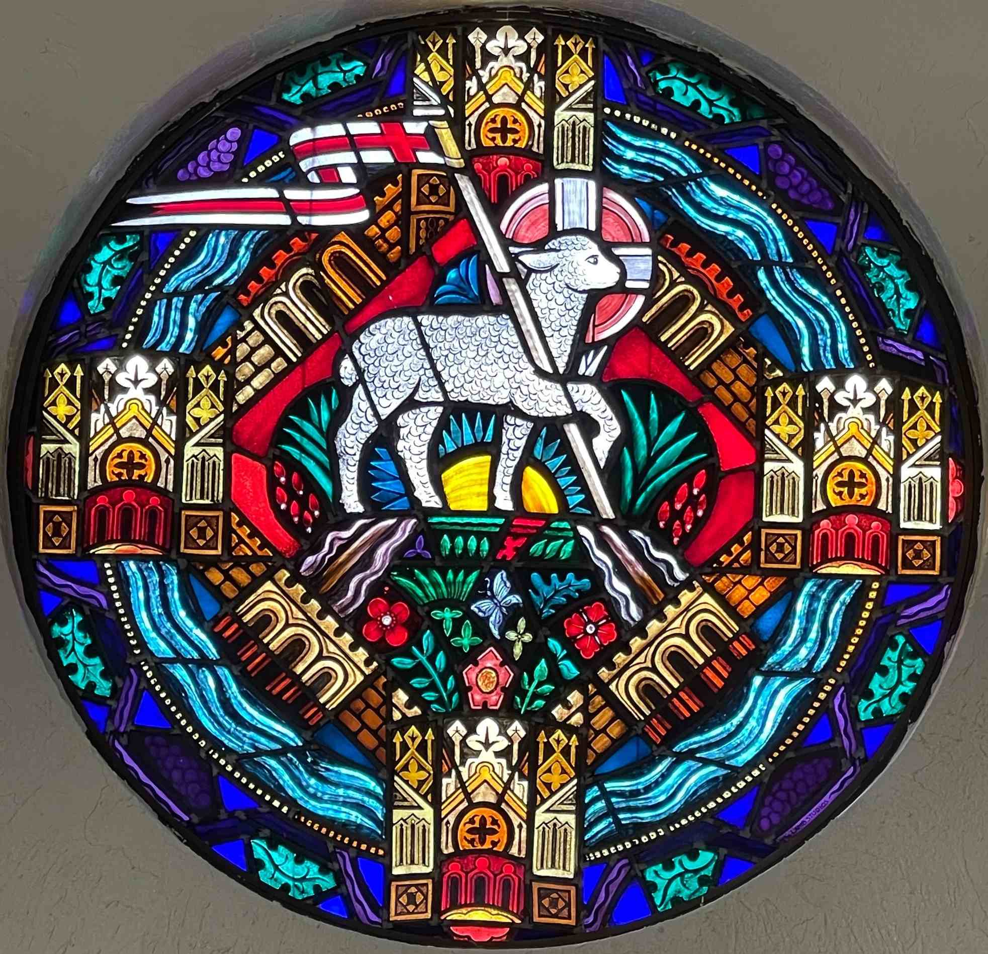 In der Washingtoner Library of Congress hat sich ein Teilnachlass der Glasmanufaktur der Lamb Studios erhalten, der vielleicht einflussreichsten Manufaktur für Kirchenglasfenster der USA in der ersten Hälfte des 20. Jahrhunderts. Unter den 2500 Dokumenten befindet sich auch eine Entwurfszeichnung aus Tusche und Aquarell der Größe 30 x 25 Zentimeter (Inventarnummer LAMB, Nr. 947). Der Entwurf ist vermutlich eine frühe Arbeit aus den 1920er Jahren von Elizabeth Clark Lamb (1809-1838), welche 1933 für die Kirche der Tuskegee University einen ähnlichen Entwurf (Lamm im Quadrat) vorlegte, dort aber ohne Bezüge zum Neuen Jerusalem (Originalfenster nicht mehr erhalten). Auf dem Entwurf schreitet im Zentrum das siegreiche Lamm voran, mit dem Georgskreuz. Es steht auf dem grünen Zionshügel, an dessen Seiten die vier Paradiesflüsse herabströmen. Es ist von einem breiten Streifen an vier Seiten umzogen, auf dem Architekturdetails wie Zinnen, Tore oder Fenster eingearbeitet sind. An die vier Himmelsrichtungen knickt das Band um 90 Grad um. An diesen Gelenkpunkten sind vier große Tortürme gesetzt, die aussehen wie gotische Kathedralen. Eingebunden sind sie in ein breites Kreisband, in dem sich ein grünes Lorbeerblatt mit einer violetten Weintraube abwechseln, Symbole für das Abendmahl und das Martyrium.