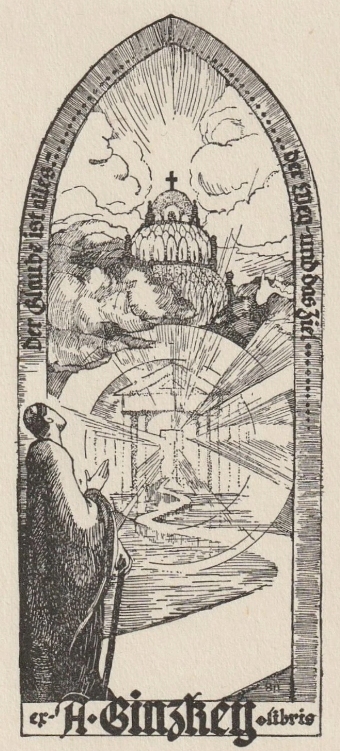 In den Rändern, die einen gotischen Spitzbogen formen, steht links „Der Glaube ist alles“ und rechts „Der Weg und das Ziel“. Wie üblich, ist auch bei diesem Exlibri kein Künstler angegeben. Die Motive deuten auf einen katholischen Hintergrund, die technische Durchführung auf einen professionellen Grafiker. Zeitlich kann, nicht zuletzt aufgrund der Schrifttypographie, das Objekt auf die späten 1920er Jahre eingegrenzt werden.