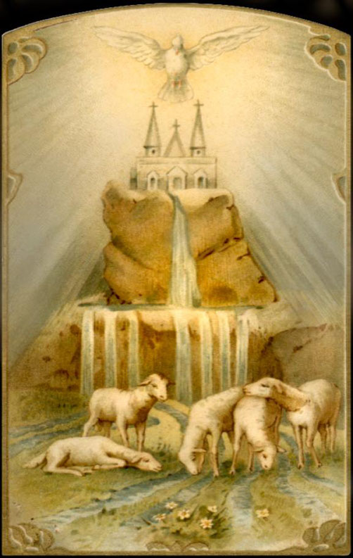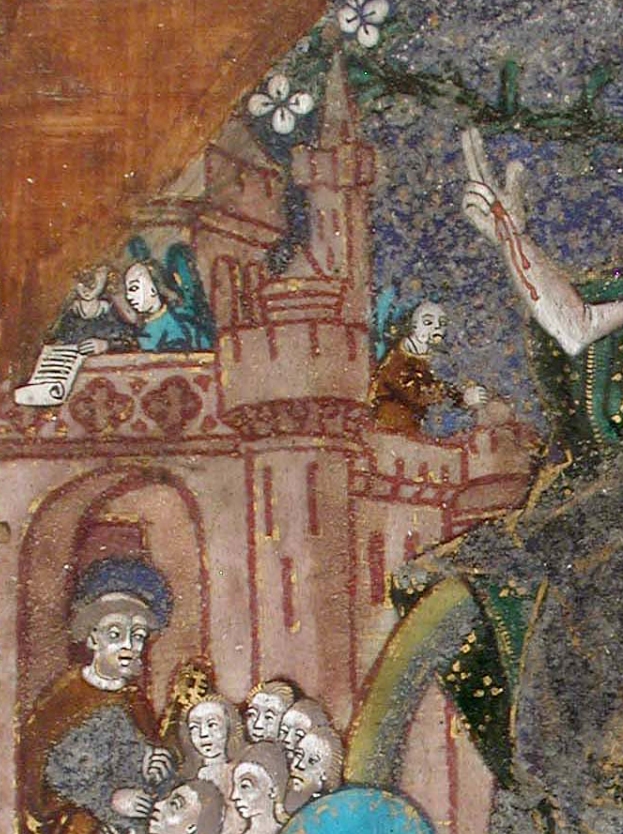 Auf engem Raum wurde auf jahrhundertealte traditionelle Bilder zurückgegriffen. Oben findet sich eine Taube mit weit ausgeschlagenen Flügeln als Symbol für den Heiligen Geist. Meist wird auf Darstellungen des Himmlischen Jerusalem die gesamte Trinität dargestellt, hier nicht. So lassen sich in der Stadtdarstellung unter der Taube weder Christus noch Engel oder Heilige entdecken. Die Stadt, ganz in weiß wie aus Marmor, zeigt auf ihrer Frontseite der Stadtmauer drei Tore mit Dreiecksgiebeln. Darüber erheben sich drei Kirchtürme mit Zeltdächern und lateinischen Kreuzen als Bekrönungen. Es ist auch nicht auszuschließen, dass die Türme sich hinter der Mauer zu einem Bauwerk vereinen. Wohnhäuser für die Bewohner, die diese Kirchen schließlich besuchen sollen, sieht man ebensowenig. Die Bebauung thront auf einem Felsen, der den Zionsberg mit dem „Fels, auf dem die Kirche gebaut ist“ (Matthäusevangelium Kapitel 16, Vers 18) in einem Bild vereint. Aus dem mittleren Haupttor strömt ein Wasserfall auf ein Plateau, um sich dort in sieben weitere Wasserfälle zu teilen – eine ausdrucksstarke Szenerie ohne direktes Vorbild oder Nachbild. Inhaltlich ist natürlich auf den Fluss des Lebens angespielt, der aus der Stadt heraus die neue Schöpfung befruchtet. Unten sind noch fünf Lämmer, die friedlich auf einer Weide versammelt sind, hinzugefügt. Christus der Hirte, de bereits in der Stadt fehlte, ist auch hier nicht präsent, anders noch als auf dem Bildtyp Vitam Aeternam oder auf armenischen Bibeldarstellungen.