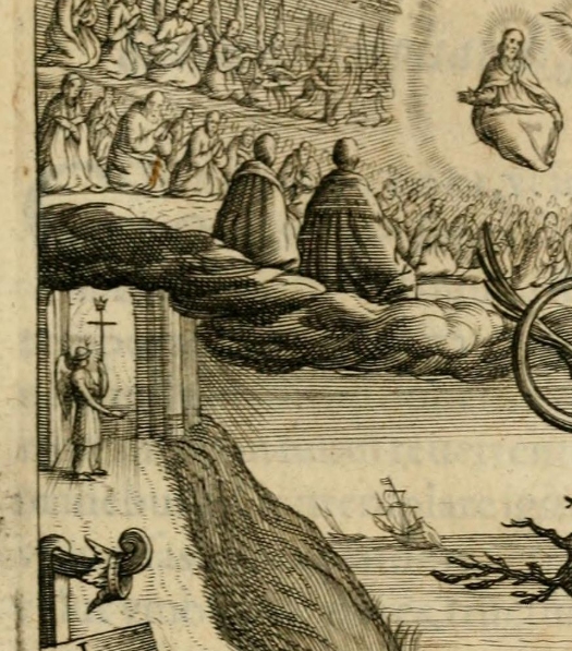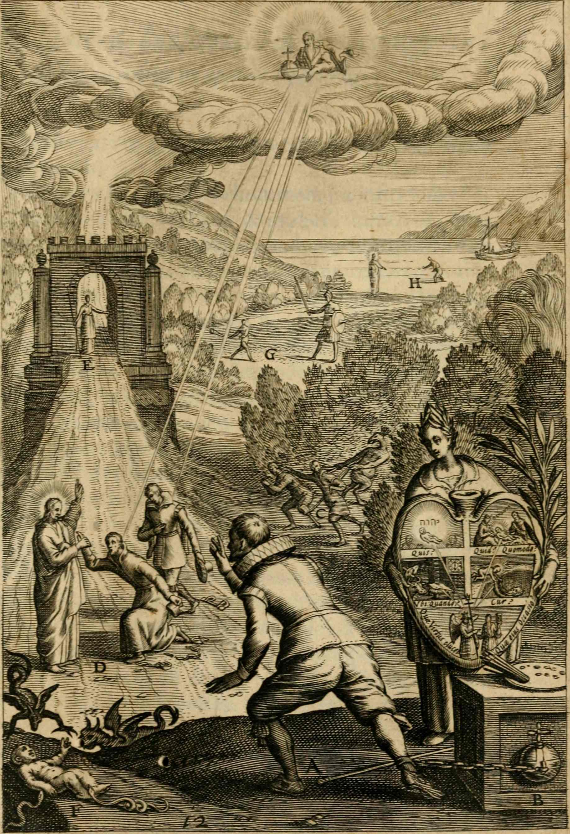 Auf dem Kupferstich zwischen den Seiten 384 und 385 beobachtet ein angeketteter, großer Mann im Bildvordergrund, wie Christus zwei gläubige Männer von ihren Sünden und ihrer Gefangenschaft erlöst. Ihr Vertrauen auf Gott ermöglicht ihnen ein gutes Leben und führt sie auf den rechten Weg zum ewigen Leben, das im Hintergrund dargestellt ist. Dort führt ein ansteigender Weg nach oben zur Himmelspforte (E) und weiter durch die Wolken in himmlische Welten. Die offen stehende Pforte ist ein mächtiger Solitär mit zwei Säulen an der Seite. Der Weg davor sieht aus wie eine aufgeschüttete Rampe, was das irdische Bemühe, diesen Weg einschlagen zu können, unterstreicht. Im Hintergrund sind biblische Szenen eingebaut, die von Versagen und Gewalt in der alten Welt berichten: Bei „G“ wird Goliath von dem Hirtenjungen David erschlagen, bei „H“ droht Petrus im See Genezareth unterzugehen.
