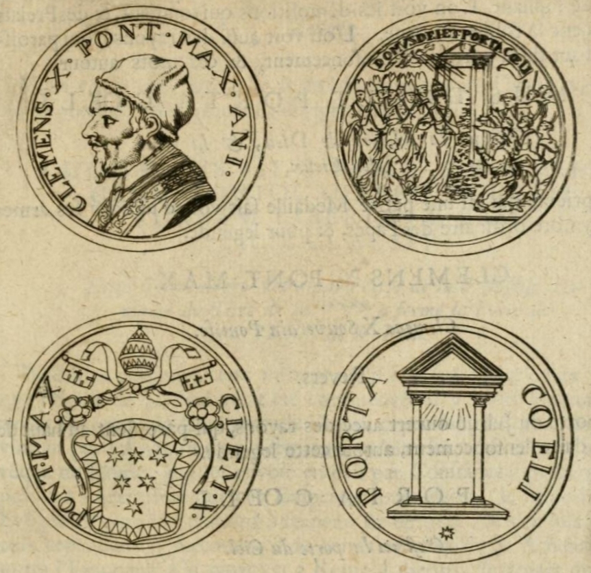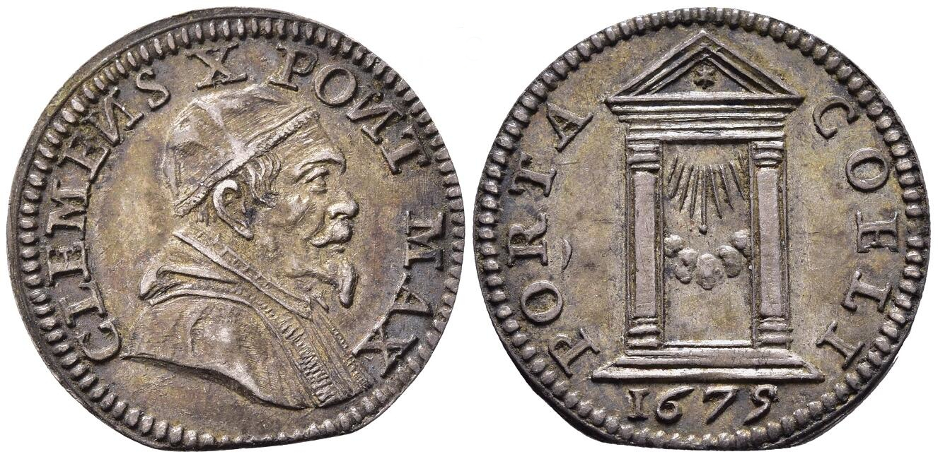 Das erste Beispiel zeigt auf dem Avers das Konterfeit des Papstes Clemens X., der hier nach links blickt. Auf dem Revers wird die historische Szene gezeigt, bei der die Pforte vom Papst symbolisch mit einem Hammerschlag eröffnet wurde. Der überirdische Kontext wird durch die Strahlen, den Engel in den Wolken und letztlich durch die Überschrift „Domus Dei et Porta Coeli“ unterstrichen.