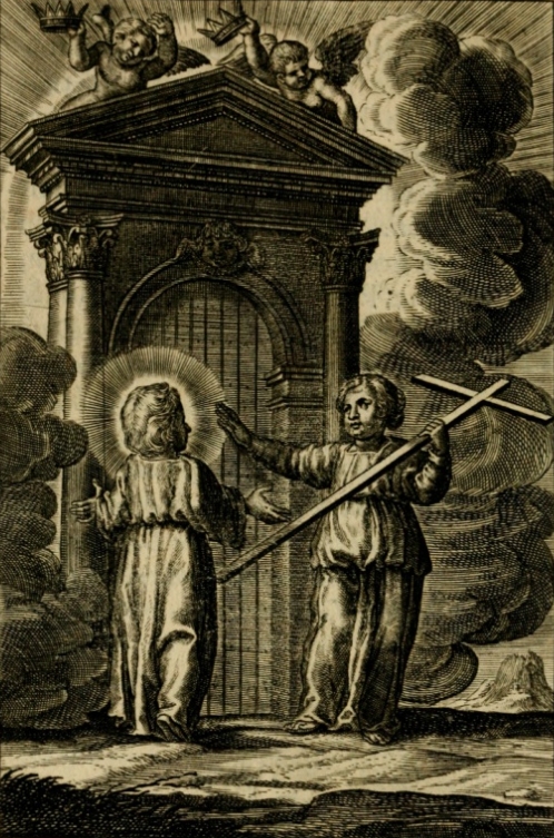 Werfen wir noch einen Blick auf die letzte Illustration von „Regia via Crucis“. Auf Seite 396 erscheinen die beiden Figuren erneut, der Kreis schließt sich. Sie stehen vor einer mächtigen klassizistischen Pforte mit korinthischen Doppelsäulen. Diese Pforte ist, seltsam wie manches in diesem emblematischen Werk, noch mit Holzlatten verschlossen. Es besteht jedoch Hoffnung auf Einlass; vom Gebälk aus winken verheißungsvoll zwei Putti mit Märtyrerkronen.