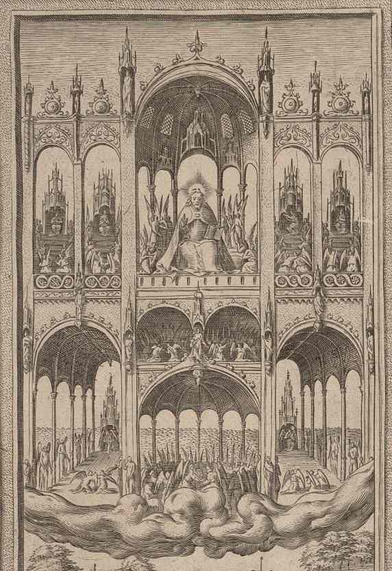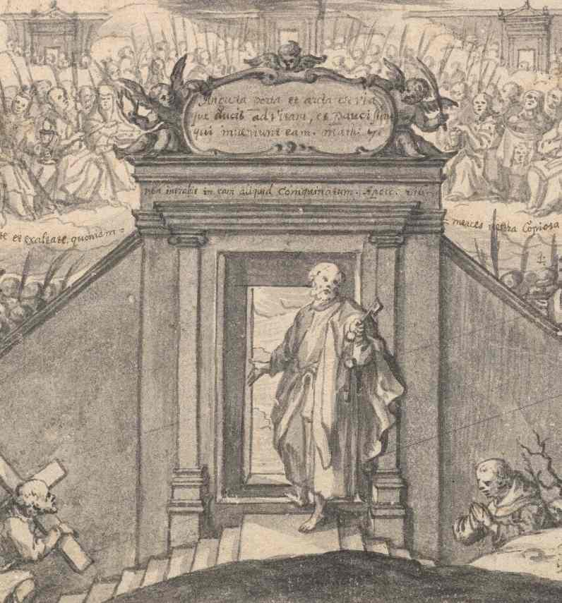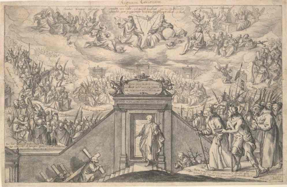 „Die Herrschaft des Himmels“ ist ein anonymes Allerheiligenbild aus dem späten 17. Jahrhundert, einer Zeichnung auf Basis von grauer Tinte. Wir erkennen zunächst eine Stadtmauer, aber in ungewöhnlicher, unrealistischer Ausführung: Links sieht man erst die Hälfte einer klassizistischen Pforte, dann ein Stück glatte, ungeschmückte Mauer. Diese läuft zunächst horizontal, um dann steil anzusteigen und auf der anderen Seite wieder abzufallen. Dadurch entsteht ein Dreieck, in welches eine große, breite Pforte gesetzt wurde. Sie ist offen, in ihr steht Petrus mit dem Schlüssel. Rechts von ihm würde man eine weitere Pforte vermuten, die möglicherweise durch Figuren verdeckt ist. Es sind müde, abgemagerte und alte Pilger, die hier ihren Lebensweg beendigen und für die hinter der Pforte das ewige Leben beginnt. Von der anderen Seite näheren sich Personen, die ein schweres Kreuz tragen, solches kennt man bereits von Cornelis Galle oder Maarten van Heemskerck, die solches schon im frühen 17. Jahrhundert zeigten. Letztlich ist es eine Form der Nachfolge Christi, der schließlich sein Kreuz getragen hat.