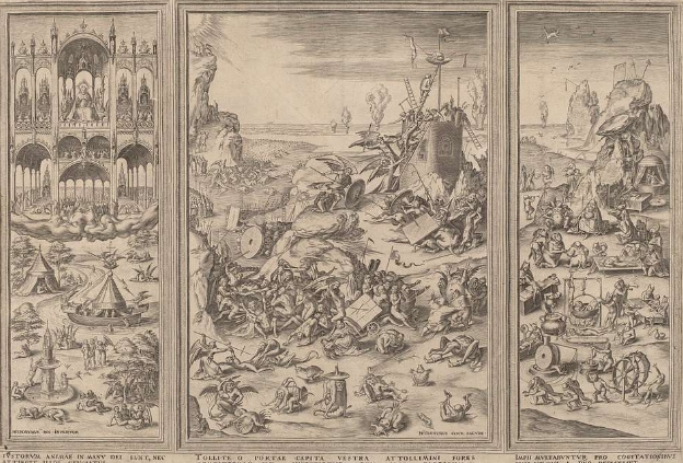 Um 1555 wurde erstmals im Verlag des Michiel Snyders das von Cornelius Cort (1533-1578) in Antwerpen gestochene Bild veröffentlicht, welches wahlweise als „Die Endzeit, Himmel und Hölle“ oder kurz „Jüngstes Gericht“ tituliert wird. Um 1600 erschien eine zweite Auflage, was die Popularität dieses Bildes mit seinen surrealen Monstern, Dämonen und Pflanzen belegt. Auf der Arbeit ist Hieronymus Bosch (um 1450-1516) als „Inventor“, als Erfinder, angegeben, doch inwieweit es von ihm eine konkrete Vorlage gab, oder ob nur ein Stich im Bosch-Stil erfunden wurde, bleibt offen. Gesichert ist aber, dass Cornelius Cort (1533-1578) ein begnadeter Kopist war, der gerne mit endzeitlichen Themen reüssierte – es verwundert nicht, hier seinen Namen zu finden; anders als Bosch, der zu dieser Zeit fast ein halbes Jahrhundert verstorben war. „Modern“ waren zu dieser Zeit andere Arbeiten.