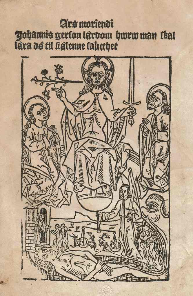 Neben den opulenten Farbsymphonien wie in Stundenbüchern, wo das Neue Jerusalem seine volle Schönheit entfalten konnte, kennt das späte Mittelalter auch das Gegenteil: Extrem einfache, farblose Zeichnungen, die in wenigen Minuten entstanden sind. Dennoch erforderte die Bildkonzeption auch hier Wissen und Können. Eine bemerkenswerte Illustration ist das Titelblatt von Jean Gersons Schrift „Ars Moriendi“, die 1514 in Uppsala (Schweden) in Altschwedisch gedruckt wurde (Stadtgeschichtliches Museum Leipzig, Signatur I K 586). Der vollständiger Titel lautet „Ars moriendi Johannis gerson lärdom hwrw man skal lära dö til siälenne salicthet“, erschienen ist es bei dem Verleger Paul Grijs.