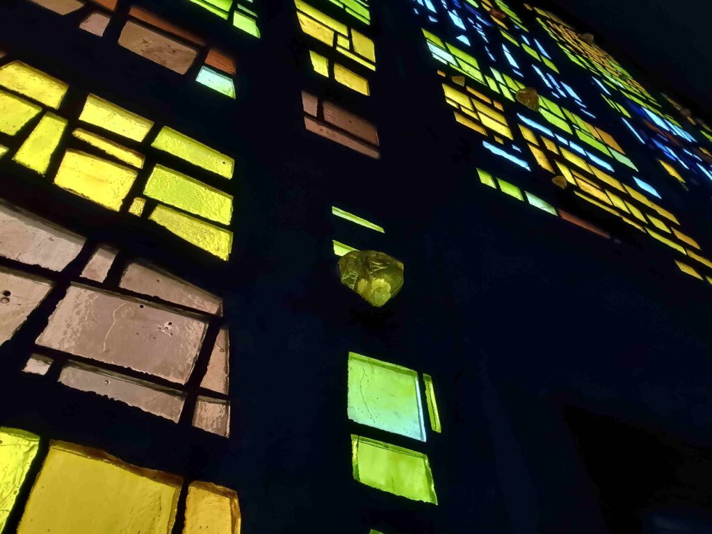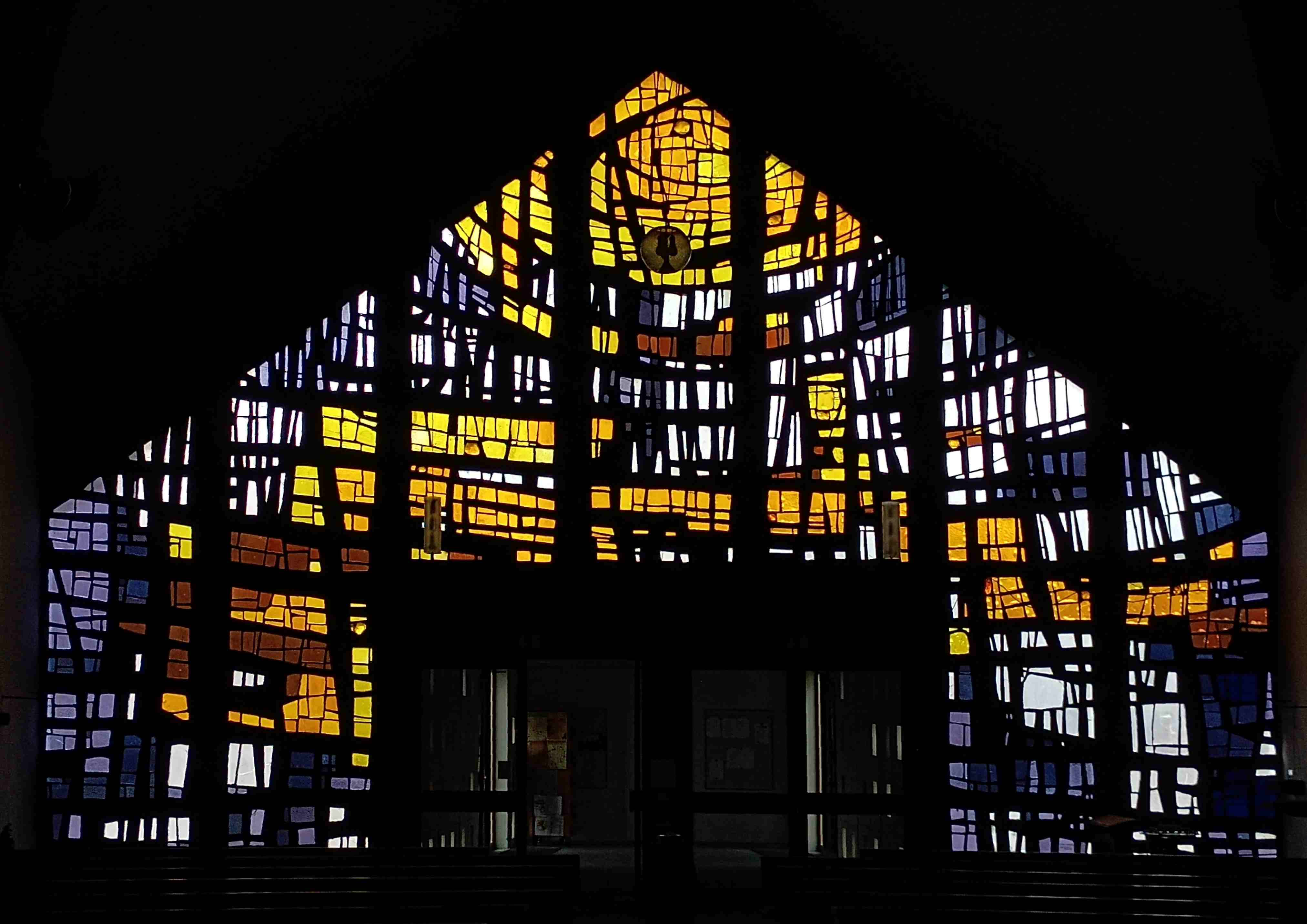 Goldgelbe Scheiben setzten sich vor blauen Scheiben zu zwei Verdichtungen zusammen: Oben, in der goldgelben Spitze des Dreiecks, konnte man ein Objekt erahnen, vielleicht ein Lamm oder eine Sonne. Weiter unten zeichneten sich die Bauten und Mauern einer Stadt ab, die sich horizontal um die zwei vorgelagerten Eingangstüren zogen. Über die Glaswand hinweg hatte der Künstler immer wieder Glasbrocken unregelmäßig verteilt, auf dieser Wand etwa ein halbes Dutzend. Sie kragen bis zu 15 Zentimeter in den Raum hinein und sind im unteren Bereich für Besucher der Kirche auch ein haptisches Erlebnis gewesen. In der erwähnten Dreiecksspitze ist ein ganz besonders großer Glasbrocken eingefügt worden, der sogar von der anderen Seite, vom Altar aus, deutlich erkannt werden kann.