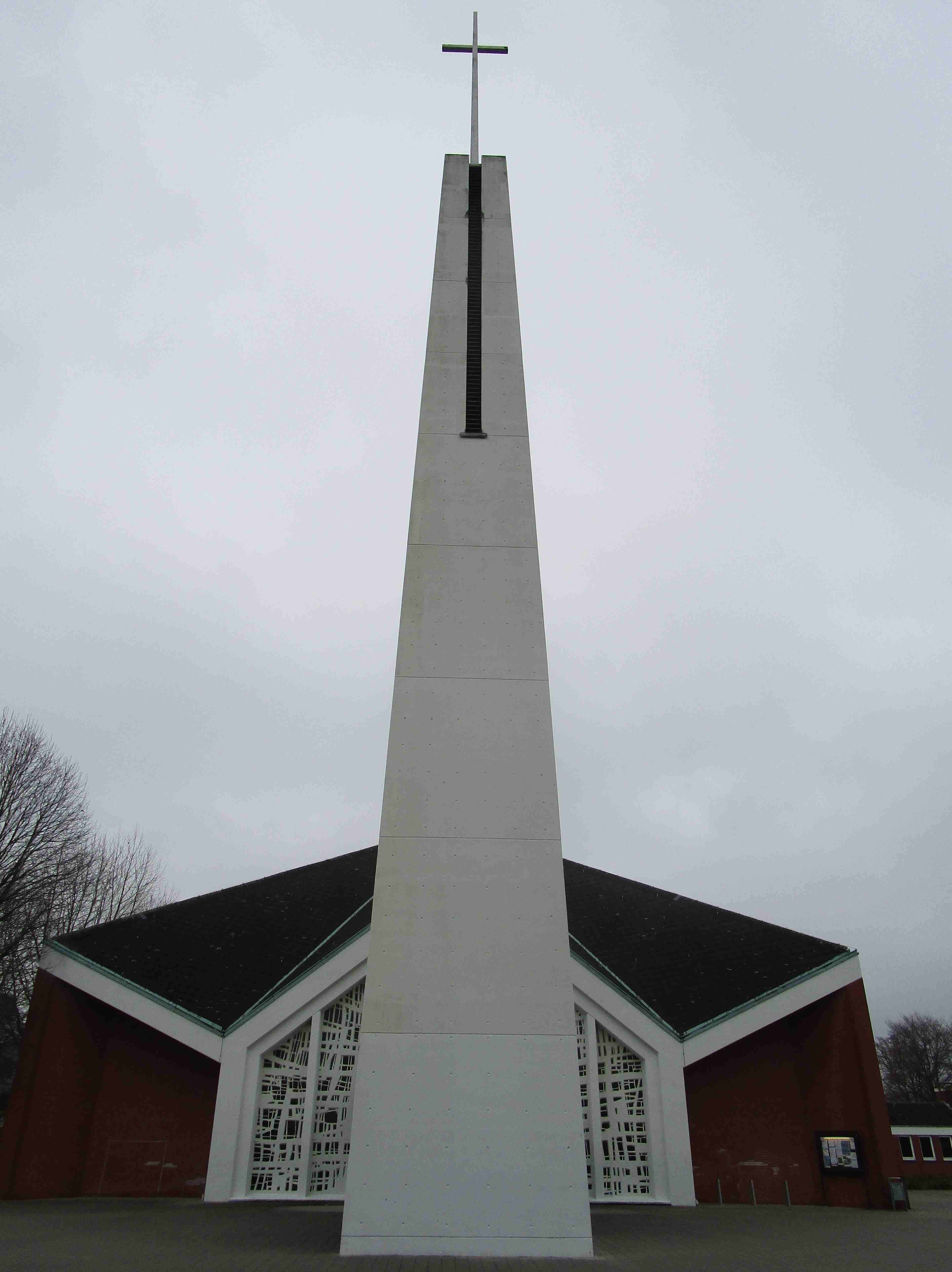 Die Gestaltung war kompliziert, denn die schweren Fensterbahnen mussten vor Ort in der frühen Bauphase 1965/66 zusammengesetzt werden; jede Scheibe musste mit der Hand in die passende Form gebracht werden, um die markante und tief liegende Oberflächenstruktur in Beton herzustellen. Dabei wurde der Künstler von Gisela Heilmann, einer ausgebildeten Malerin und Mosaizistin, unterstützt, die er 1965 heiratete. Beide führten seitdem alle größeren Aufträge gemeinsam aus. Hier musste sich das Künstlerpaar eng mit den Architekten Hans Ostermann und Fritz Bette abstimmen, die eigens für diesen Neubau eine temporäre Werksgemeinschaft gebildet hatten. Als 1967 die Kirche eingeweiht werden konnte, standen die Fenster bereit zwei Jahre im Rohbau.