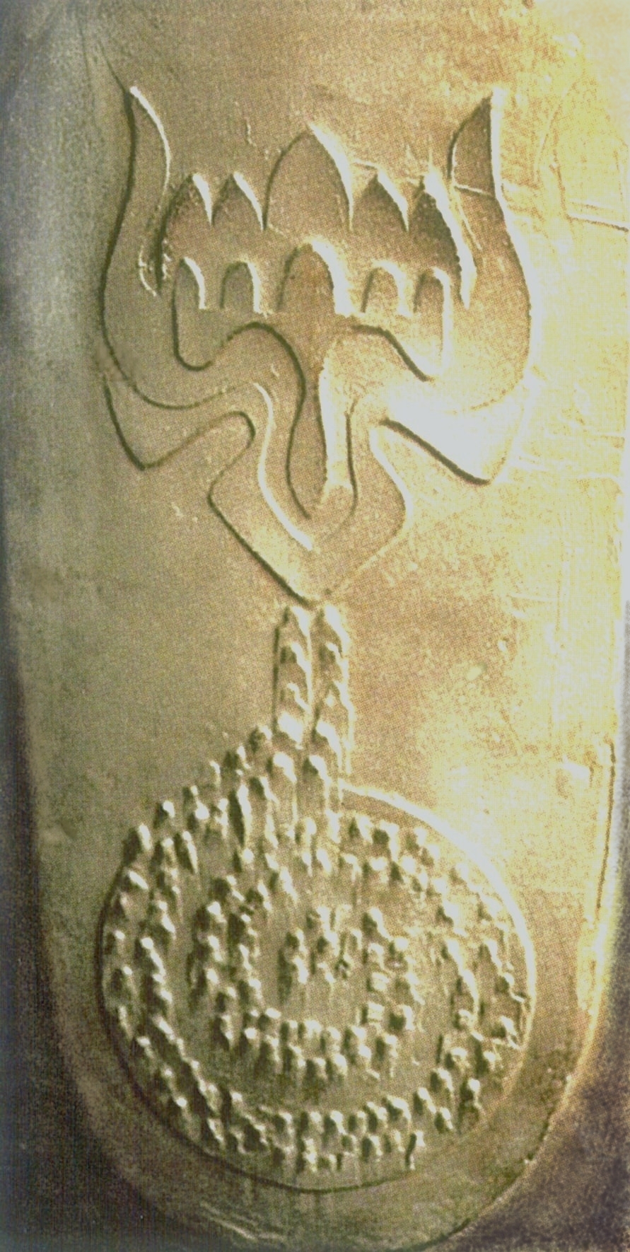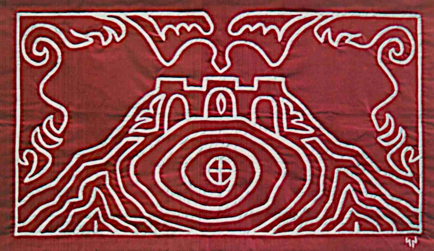 Aus dem folgenden Jahre 1993 ist der Wandbehang „Die neue Welt“, in der sich die Offenbarung Johannes „Auf einem hohen Berg zeigte mir die Heilige Stadt Jerusalem“ mit Teresa von Avilas „Ich möchte unsere Seele als eine Burg betrachten“ figürlich vereinigt. Die Blume aus der früheren Arbeit wurde hier zu einer Taube über der Stadt. Wenige breite weiße Linien erzeugen ein Stadtbild von großer Suggestivkraft, was durch den bordeauxroten Hintergrund zusätzlich gesteigert wurde.