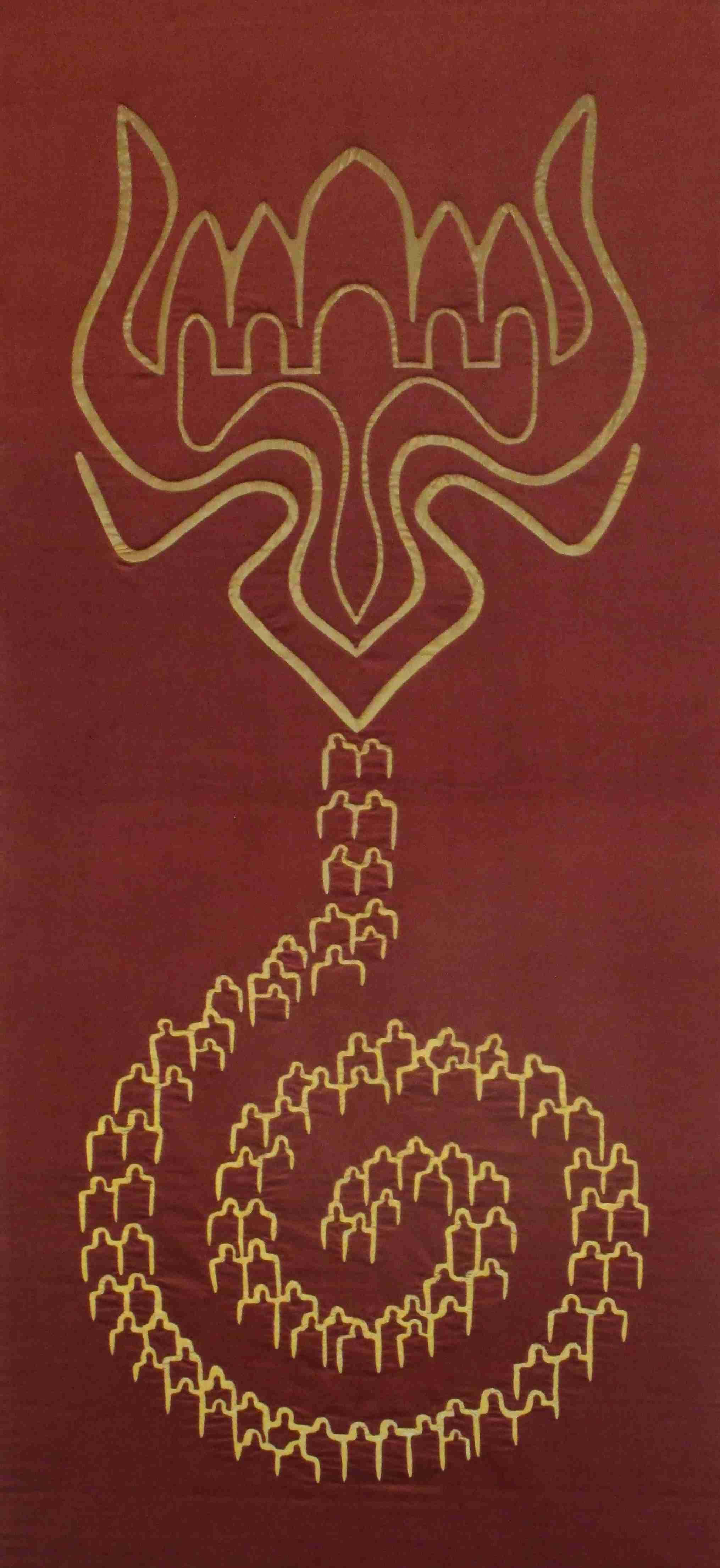 Dort besitzt die Gemeinde eine Serie von Wandteppichen der Künstlerin, die ganz bewusst für diesen Kirchenraum entstanden sind. Sie werden zu unterschiedlichen Monaten gezeigt; der mit dem Neuen Jerusalem im Monat November. Oben ist der Wandbehang ausladend, in einer großen Klarheit mit breiten Linien. Dieser Teil hat eine Bewegung, die sich von oben nach unten senkt. Im unteren Teil des Bildes findet eine Gegenbewegung statt: Aus einer Spirale heraus nach oben: Gott (oben) und die Menschen (unten) kommen sich entgegen. Die Linien sind filigran und bilden im oberen Bereich drei Figuren ab, nämlich eine Krone, Stadttore und eine Taube als Symbol für den Heiligen Geist, wonach die Bielefelder Gemeinde benannt ist. Alle diese Details wurden mit kupferfarbenen Goldfäden in den bordeauxroten Wandteppich eingenäht. Auf der Rückseite ist das Werk im unteren Bereich auch signiert und datiert.