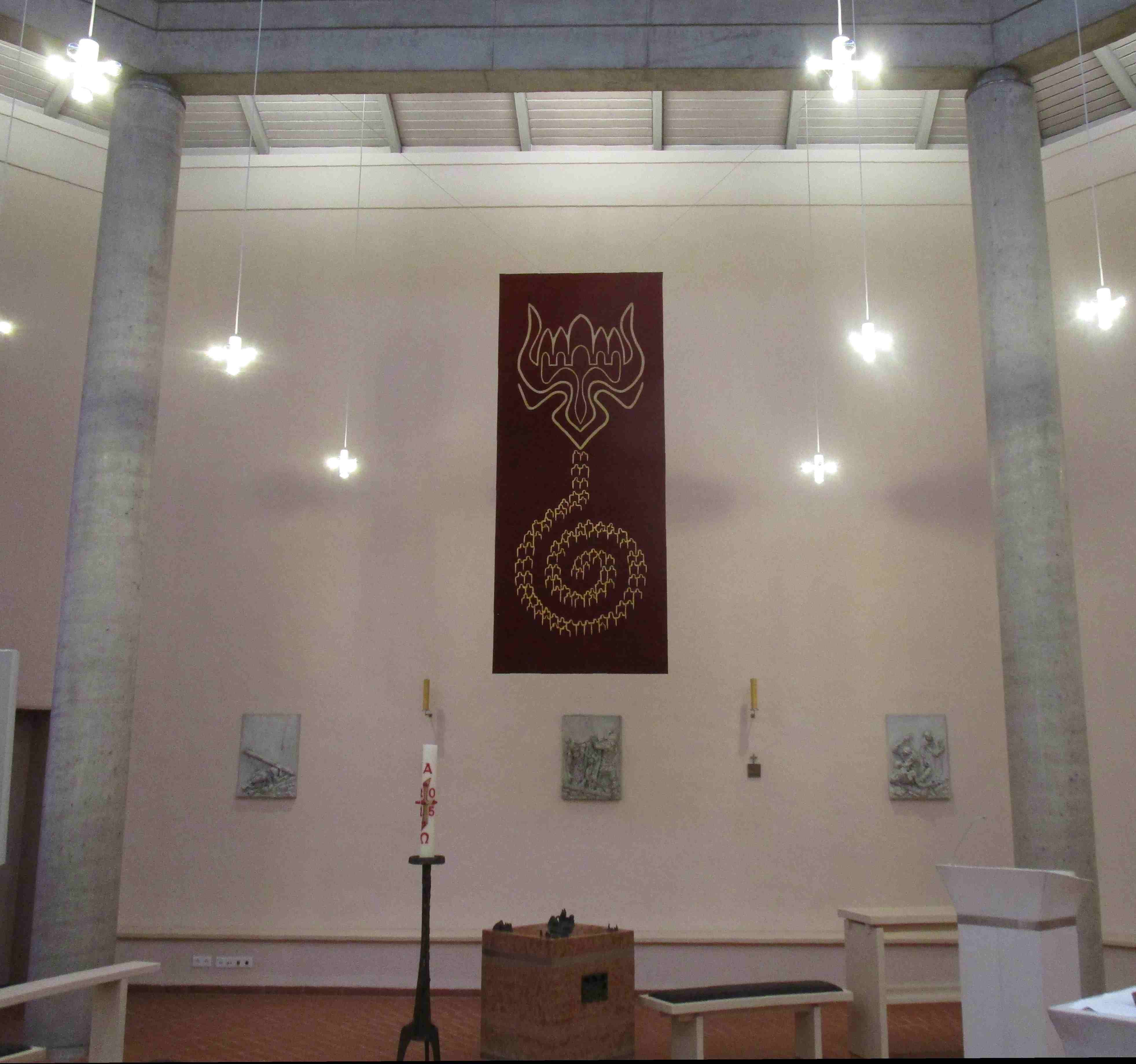 Im Jahr 1992 entstand „Das Neue Jerusalem“ als Wandbehang durch die deutsch-rumänische Künstlerin Magdalena Hofmann-Soare. Das Orange des Hintergrunds spielt an die erleuchtete Herrlichkeit Gottes und das Blau der Linienführung an das Wasser des Lebens an. Die Linien ergeben ein Quadrat, das an den vier Seiten so stark ausbuchtet, dass dort große Tore entstehen. In einem Zwickel finden sich der Buchstabe „A“, in einem anderen der Buchstabe „W“, zwei Felder sind frei gelassen. In der Mitte des Quadrats ist eine Blume eingefügt.