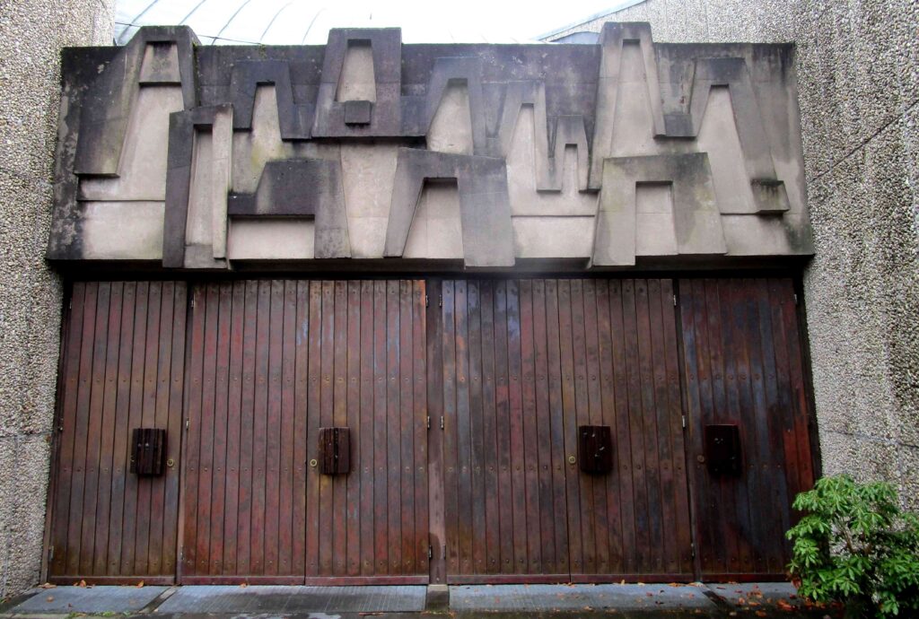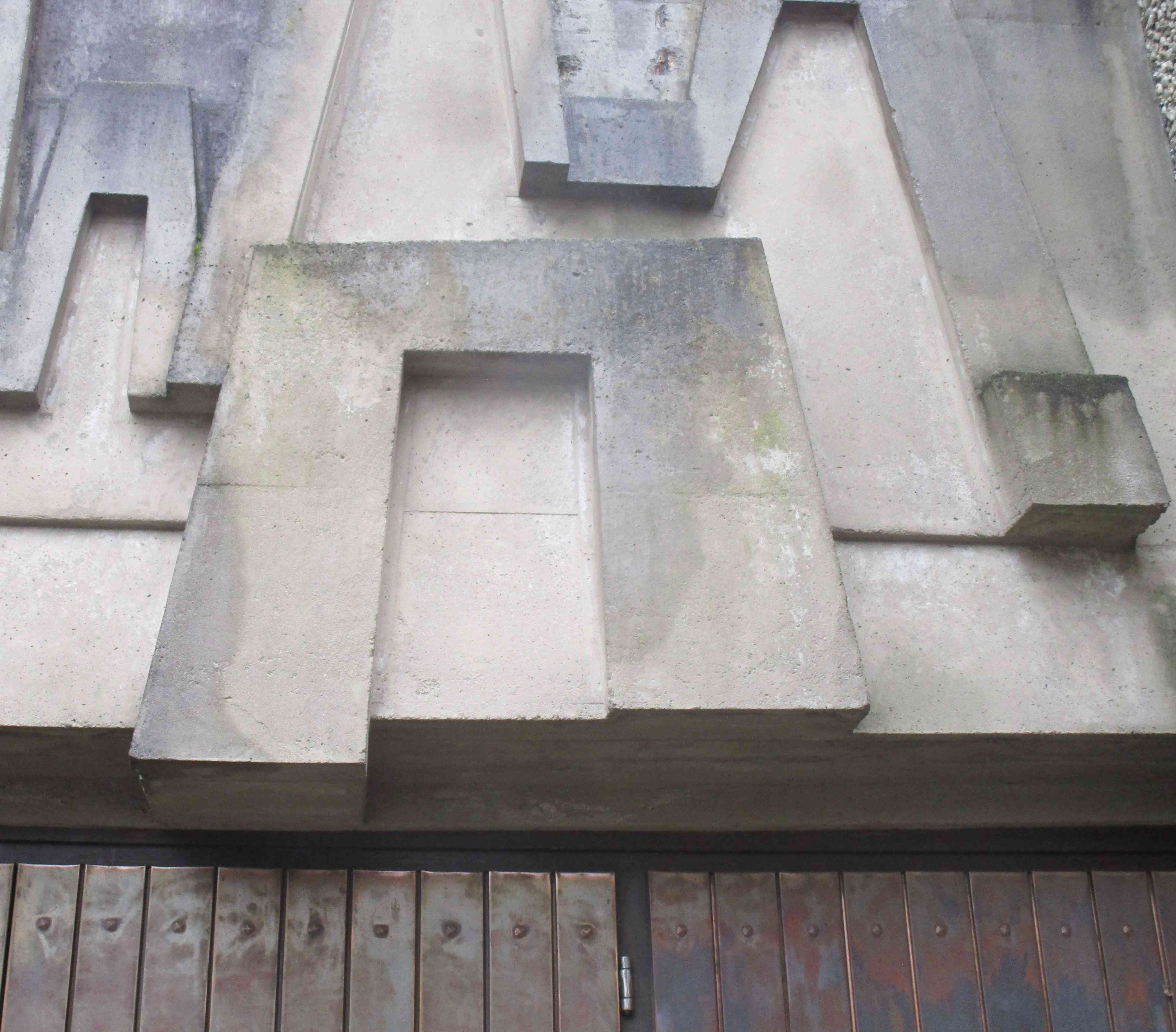 Über diese wurde, in freier Anlehnung an einen mittelalterlichen Tympanon, ein zwei Meter hoher Fries aus Sichtbeton gelegt. In zwei Zonen sind zwölf einfache Blocktore aneinander gereiht, oben acht und unten vier. Sie unterscheiden sich vor allem in der Größe. Eines der Tore, das dritte der oberen Reihe, hat am Fundament einen quadratischen Block vorgesetzt – ein Verweis auf Christus als den verworfenen Eckstein (Psalm 118, 22).