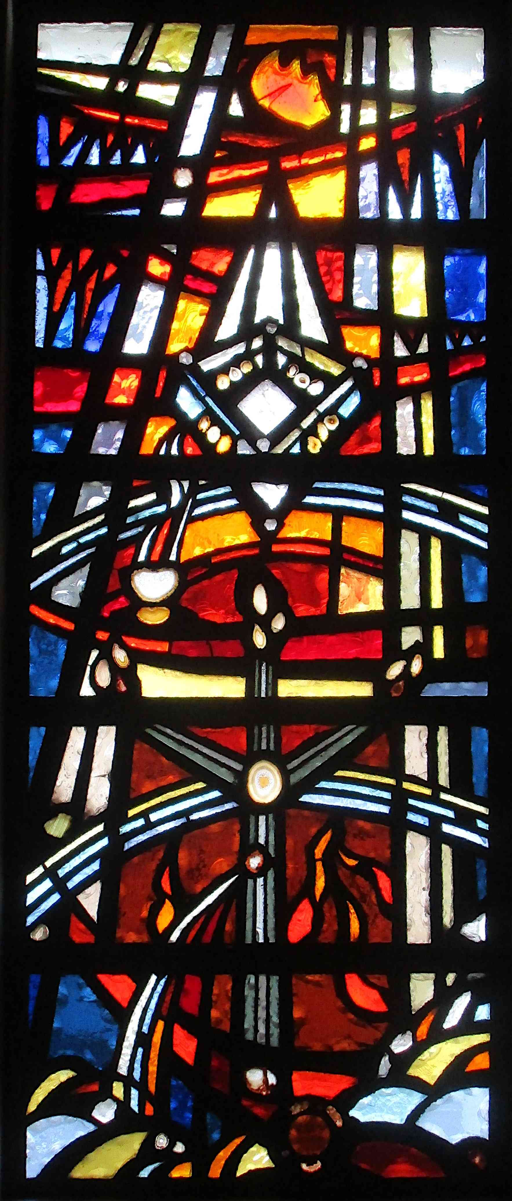 Das letzte rechteckige Fenster im Bereich der Orgel an der linken Seite (zum Altar hin ausgerichtet) basiert auf den Farben Rot und Blau, die nicht nur die Farben Mariens, sondern auch die des Himmlischen Jerusalems sind. Im unteren Bereich sieht man stilisiert den Gekreuzigten, bei dem Blut aus der Seitenwunde nach unten strömt. Im Kreuzpunkt der Arme, etwa auf Höhe des Herzens, ist eine weiße Achatscheibe gesetzt. Die roten Flammen in diesem Bereich fügte die Künstlerin als Hinweis auf den Heiligen Geist ein. Direkt darüber markiert ein geschlossenes Viereck das Neue Jerusalem, mit jeweils drei gelben Toren an einer Seite. Nur aus der Nähe ist zu erkennen, dass jedes der ovalen Tore aus einer geschnittenen Achatscheibe besteht. In den vier Ecken wurde jeweils ein Bergkristall gesetzt. Die Stadt schwebt auf einem Friedensbogen, der sich bereits unten bei der Kreuzfigur findet. Zu der linken Seite fließt auch hier etwas in einen Kelch, vermutlich das Wasser des Lebens oder der Wein des Abendmahls, denn das Neue Jerusalem ist der Ort des ewigen Abendmahls.