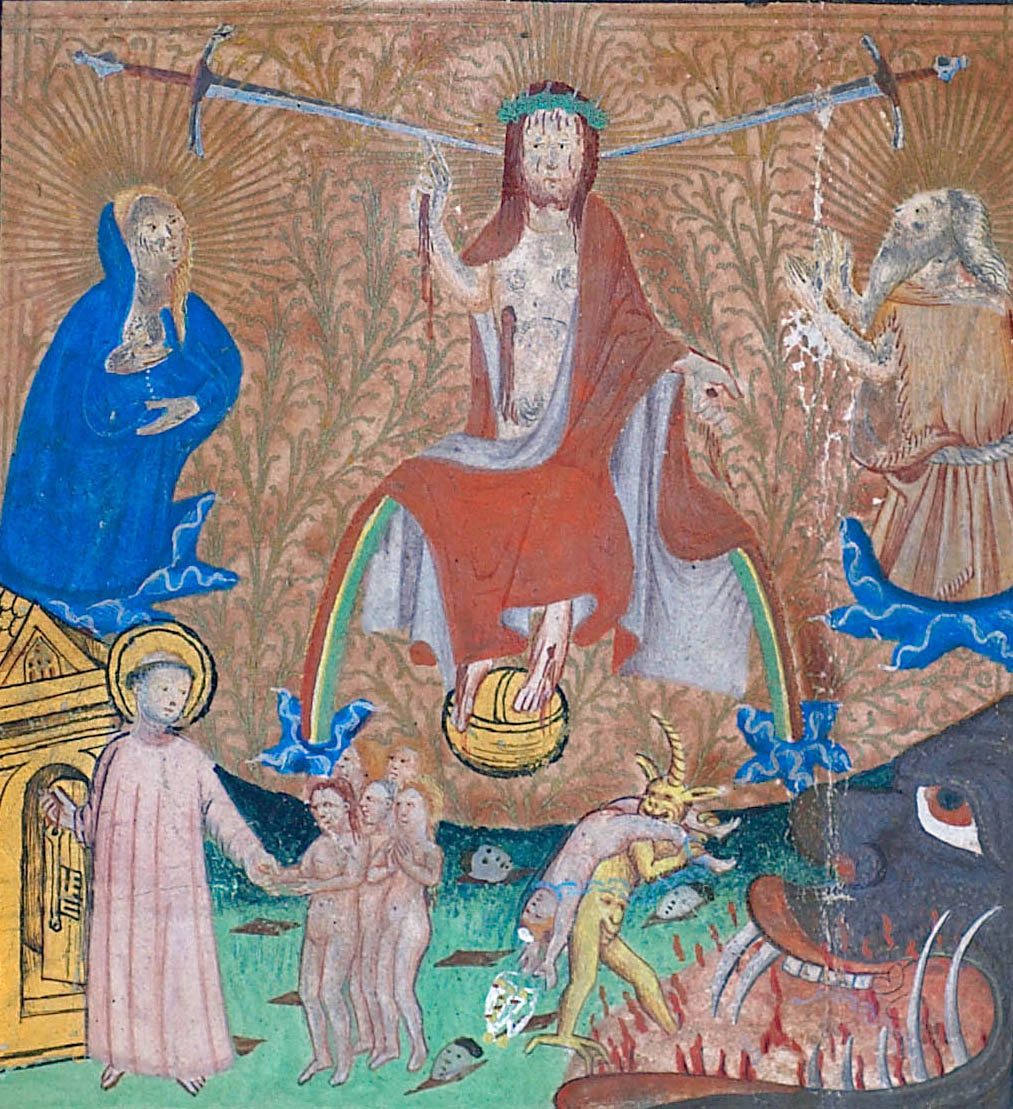 Hier sehen wir die verzierte Initiale der Gründungsurkunde der „Bruderschaft der Elenden Seelen in der Buurkirche“, einer Kirche in Utrecht, aus dem Jahr 1436. Das Einzelblatt mit seiner Miniatur wurde von dieser Bruderschaft herausgebracht und finanziert, sie wird auch maßgeblichen Einfluss auf die Wahl dieses Motivs genommen haben. Ein Weltgericht war damals nichts Ungewöhnliches, fast gehörte es zur bildlichen Standardausstattung – nur wenige andere Motive hatten damals eine vergleichbare Popularität. Man findet ähnliche Darstellungen zu Beginn des 15. Jahrhunderts in der Legenda Aurea (1405), einem Stundenbuch (1430-1460) oder auf Tafelmalereien wie einem Altarbild des Meisters der Passionsfolgen (um 1410). Kennt man die verschiedenen Darstellungstypen, fällt sogleich auf: Ein Himmlisches Jerusalem, komplett in Gold, erinnert an die Erbachschen Tafeln, ist aber als Miniaturmalerei ein Novum. Die Idee, die Stadt Jerusalem pars pro toto als Kirchenbau darzustellen, war dagegen gängig und entsprach der Erwartungshaltung. Kurios, selbst für die an Kuriositäten reiche mittelalterliche Darstellungsvielfalt, sind die auf der Wiese auftauchende Köpfe der Verstorbenen – man findet Ähnliches später nur noch einmal in dem Gebetbuch MS Germ. Oct. 270.