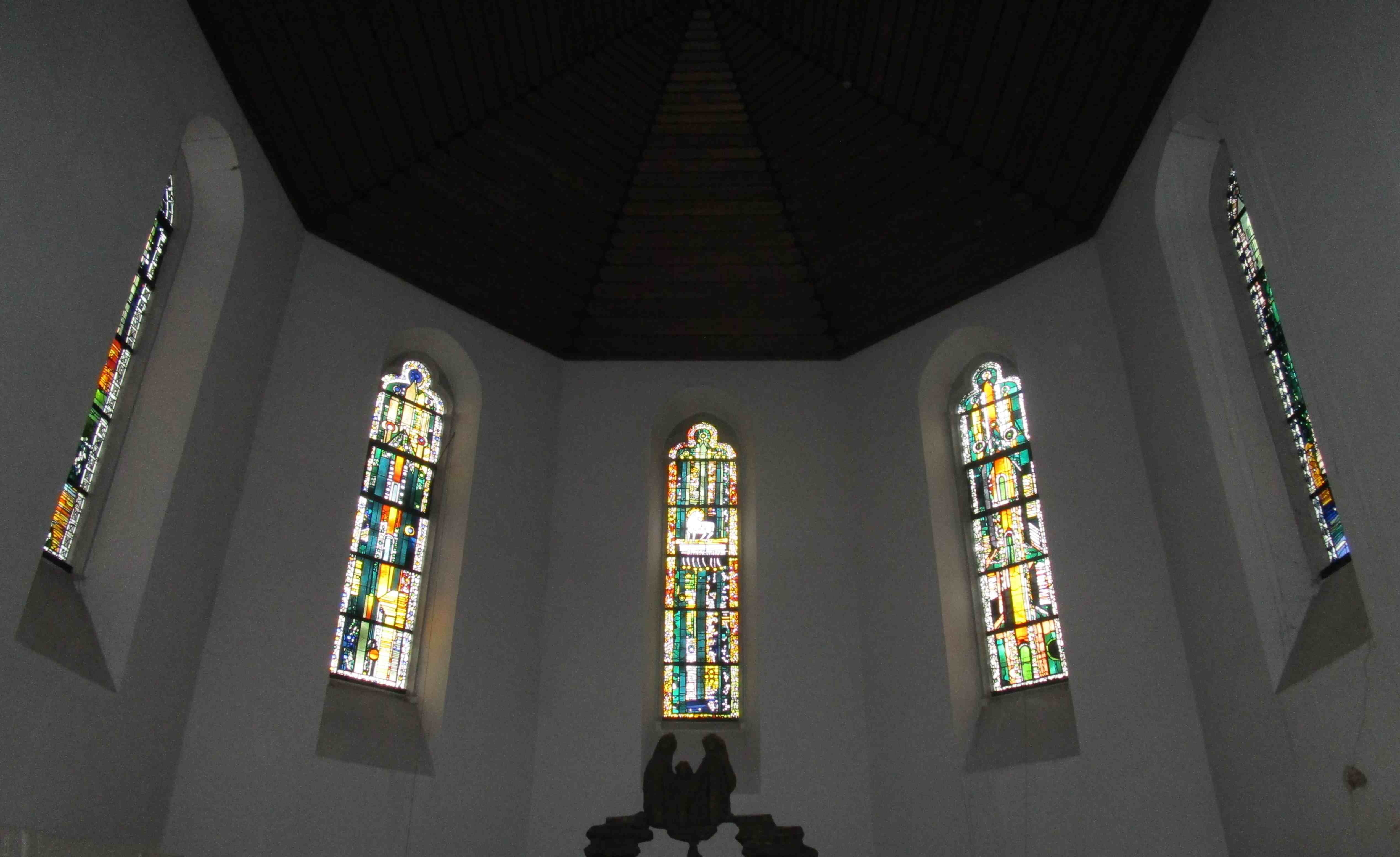 Die die späteren Ergänzungen im Chor fanden bislang kaum ein Interesse, so dass es auch länger dauerte, bis etwas über die Entstehung herausgefunden werden konnte. Ende der 1970er Jahre erweiterte man die Kirche um den Chorbereich, der noch kriegszerstört vermauert war. In die fünf Fensteröffnungen wollte man eine Darstellung des Neuen Jerusalem haben, möglichst „unter Bezug des Lichts in einer modernen, dem heutigen Glaubensverständnis angemessenen Formensprache mit zurückhaltender Figürlichkeit. Mit Ausnahme des Christus, den wir uns in Gestalt des Lammes auf den sieben Siegeln wünschen, wie es in der Offenbarung des Johannes erwähnt ist“. Hildegard Bienen löste die Aufgabe, indem sie das Lamm auf dem Buch in das mittlere Fenster setzte, und die Tore der Stadt auf die übrigen vier Fenster verteilte. Das erste und letzte Fenster zeigen jeweils drei schmale, vertikale Türme im oberen Bereich, die nach unten in horizontale Edelstein-Streifen übergehen, zwischen die immer wieder Perlen gesetzt sind. Es sind die beiden Fenster, die spitz zulaufen, während die anderen drei Fenster oben in einem Knauf münden.