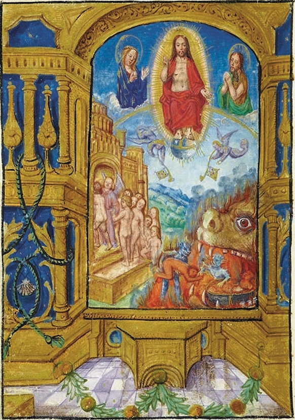 Fol. 293v (Größe 13 x 9 Zentimeter) hat das Weltgericht zum Thema. Ähnlich wie Kalenderblätter gehörte ein Weltgericht gewissermaßen zur Standardausstattung eines Stundenbuchs, man orientierte sich am Gewohnten. Hier findet sich allerdings die Besonderheit, dass das Gericht als Bild im Bild gesetzt wurde: Der äußere Rahme ist ein zweistöckiger Arkadenbau, der bereits Ansätze der Frührenaissance zeigt. Der Bau ist goldfarben gesetzt, der Hintergrund vornehmes Könisgblau, das Schachbrettmuster im Vordergrund eine perspektivische Herausforderung.