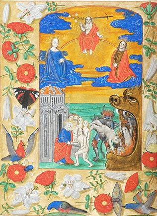 Die Rahmung verweist bereits auf die Frührenaissance, die Binnenzeichnung ist in ihrem Thema noch mittelalterlich. Vor allem die Gegenüberstellung von Neuem Jerusalem und Verdammnis findet sich bereits in der Spätantike. Über die Jahrhunderte hinweg entwickelten sich eigene Traditionen, um 1495 war es Mode, die Hölle als Drachenmaul mit einem Fantasiewesen zwischen Wolf, Drachen und Hund zu zeigen. Auf der gegenüber liegenden Seite wird die Stadt nicht, wie zuvor oft, als Kirche gezeigt, sondern als symmetrischer Rundbau im oberitalienischen Stil der Frührenaissance des Quattrocento – solche Bauten gab es bereits in Florenz und Pisa. Auch der Schwarzaugenmeister, immer auf der Höhe seiner Zeit, kannte solches bereits von einem ca. zehn Jahre zuvor entstandenem Stundenbuch Codex 1117. Hier wurde die Szene etwas dramatisiert: Links zieht Petrus einen nackten Menschen auf seine Seite, rechts wirft ein gehörntes Monster einen Menschen in das Drachenmaul. Der Begriff „jemanden auf seine Seite ziehen“, heute profan verwendet, entstand im Kontext solcher Weltgerichte und ist erstmals in Mittelhochdeutsch seit dem 14. Jahrhundert nachgewiesen.