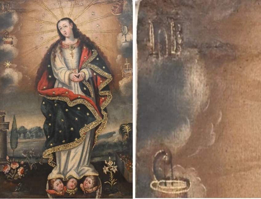 Diese 75 x 55 Zentimeter große Ölmalerei der Maria Immaculata bedient sich einer Darstellungsweise des 17. Jahrhunderts, entstand aber erst im frühen 21. Jahrhundert – erstmals nachgewiesen ist ihre Existenz 2021, als behauptet wurde, dieses Werk wäre angeblich im Umkreis von Pedro de Vargas noch ein Jahrhundert früher entstanden – ein einziger Blick auf die Ausführung der Arbeiten de Vargas, der die Maria Immacualta zudem nicht gemalt hat, belegt die Fragwürdigkeit einer solcher Zuschreibung. Die Himmelspforte ist hier an ihrer traditionellen Position oben links rudimentär aufgemalt. Farblich unterscheidet sie sich kaum vom Hintergrund, sondern ist mehr durch die Vergoldungen sichtbar. Würde man einem Unwissenden lediglich dieses unförmige Objekt zeigen, käme er wohl kaum auf die Idee, dass hier die Porta Coeli gedacht ist. Die anderen Symbole imitieren gekonnter den neuspanischen Kolonialstil. Im unteren Bereich findet sich jedoch neben der Rose und der Lilie eine dritte Blumensorte, was die Lauretanische Litanei nicht kennt. Zusätzlich ist dieser Blumenstrauß verwelkt (!) und damit wohl kaum als angemessenes Mariensymbol geeignet.
