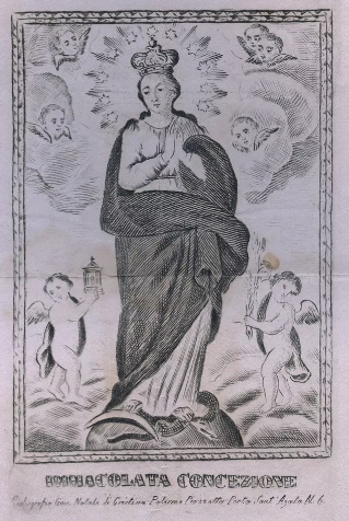 Ebenfalls aus Süditalien ist diese 22 x 15 Zentimeter große „Cartografia“ aus Palermo unter dem Titel „Immacolata Concezione“, gedruckt bei Gaetano Natale di Cristino in unbekannter Auflage um 1800. Geprägt im Aufbau ist diese Gravur selbstverständlich von den vorausgegangenen Malereien, wobei hier sogar der Rahmen einer Malereien imitiert wird. Neben Maria fallen sieben Engel ins Auge. Oben kreisen sie um Maria, unten halten sie zwei ihrer Symbole nach oben, nämlich die Lilie und die Himmelspforte. Diese ist ein klassisches Bauwerk, das mit einer Figur im Inneren besetzt ist, möglicherweise mit einem achten Engel. Auch im Original sind solche Details kaum zu erkennen, die Zeichnung ist aus wenigen Strichen schnell zusammengefügt worden. Die Einfachheit zeigt sich nicht nur in der Farblosigkeit oder der geringen Zahl an Mariensymbolen, sondern vor allem an dem schlichten Gewand Mariens ohne jede Verzierung oder Akzentuierung – im Barock kurz zuvor unmöglich.