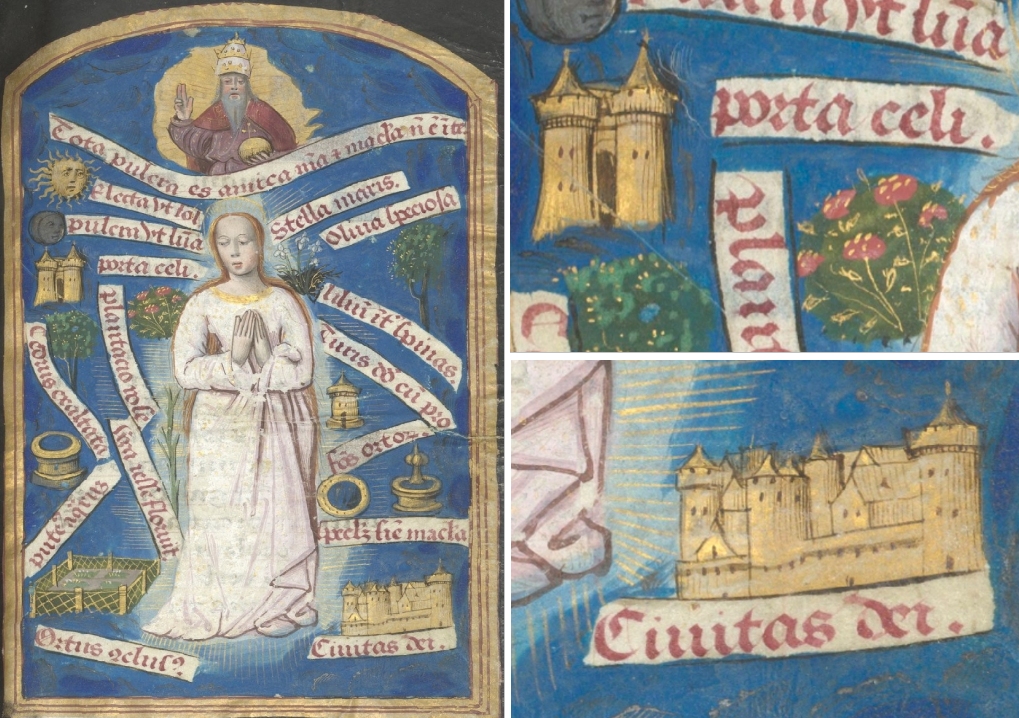 Die Gebete und Andachtstexte von sind in Altfranzösisch, als Entstehungsort wird ein Skriptorium bei Paris vermutet. Die sieben ganzseitigen Miniaturen des Bandes sind auffällig dunkel, Blau und Schwarz sind die vorherrschenden Farben. Über der stehenden Marienfigur erscheint Gottvater im Himmel, mit Tiara und vor goldenem Hintergrund – diese Elemente sind noch im 15. Jahrhundert verwurzelt, wie auch der vergoldete Rahmen. Um die Marienfigur wurden nicht weniger als 14 Symbole gesetzt. Die meisten sind ganz in Gold gehalten, so auch die Porta Coeli oben links und die Civitas Dei unten rechts. Die Himmelspforte zeigt sich, wie eigentlich alle Pforten des 16. Jahrhunderts, als Stadttoranlage mit zwei Türmen. Die Civitas Dei ist weniger gut zu erfassen. Die Stadtmauer und die Bauten in der Stadt verschmelzen zu einem rechteckigen Block. Überhaupt ist das Rechteck charakteristisch für die künstlerische Ausgestaltung dieser Miniatur. Das kann man sehr gut an den Schriftbändern erkennen, die eigentlich Schriftblöcke heißen müssten. Die breiten weißen Streifen passen kaum zu den feinen Federzeichnungen. Auch aus vorherigen oder späteren Stundenbüchern sind keine derart dominant hervorgehobenen Schriftbänder bekannt.