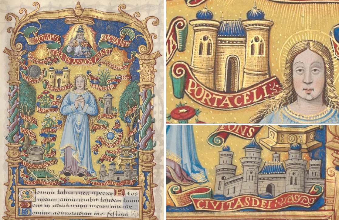 Ein letztes Stundenbuch, welches die Mariensymbole in der inzwischen schon gewohnten und weit verbreiteten Anordnung Kervers zeigt, erschien um 1531 (MS Latin 1175, BnF). Es war einst im Besitz des Gelehrten Étienne Alleaume, später gelangte es in die Pariser Bibliothek Arsenal, schließlich in die Französische Nationalbibliothek. Das ganze Blatt ist weniger stilistisch einheitlich als seine angeführten Vorgänger, so ist der goldene Hintergrund von fol. 59r noch mehr der Gotik verhaftet, während der opulente Rahmen bereits Merkmale der Frührenaissance aufweist. Die Architektur ist etwas schematisch; so sieht die Porta Coeli oben links fast ebenso aus wie der Mittelteil der Civitas Dei unten links. Biforienfenster, niedrige Türme und blaue Dächer kennzeichnen die Bauten beider Symbole, die alle in einem golden-bordeauxroten Schriftband im Stil des frühen 16. Jahrhunderts in Latein bezeichnet sind. Zusätzliche Farbakzente und vergoldete Ornamentik heben die Bezeichnungen besonders hervor.