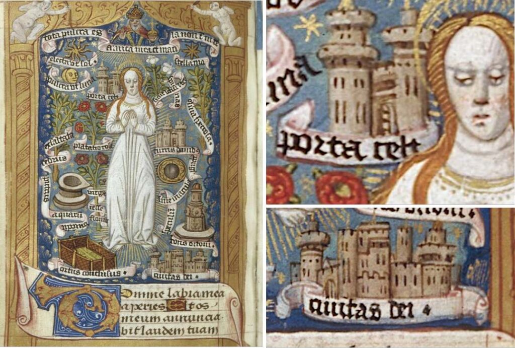 Wie bei den Fassungen der ersten Generation üblich sind die Porta Coeli und die Civitas Dei oben links bzw. unten rechts zu finden. Selbstverständlich für das 16. Jahrhundert sind sie mit einem lateinischsprachigen Schriftband ausgestattet. Damals war die Bildkonzeption neu und ungewohnt. Die Beschriftung half also, die eigenartigen Objekte (wie etwa einem umzäunten Garten = Hortus Conclusus; eine Scheibe, die wie ein Schild aussieht = Marienspiegel) zu identifizieren und erklären zu können.
