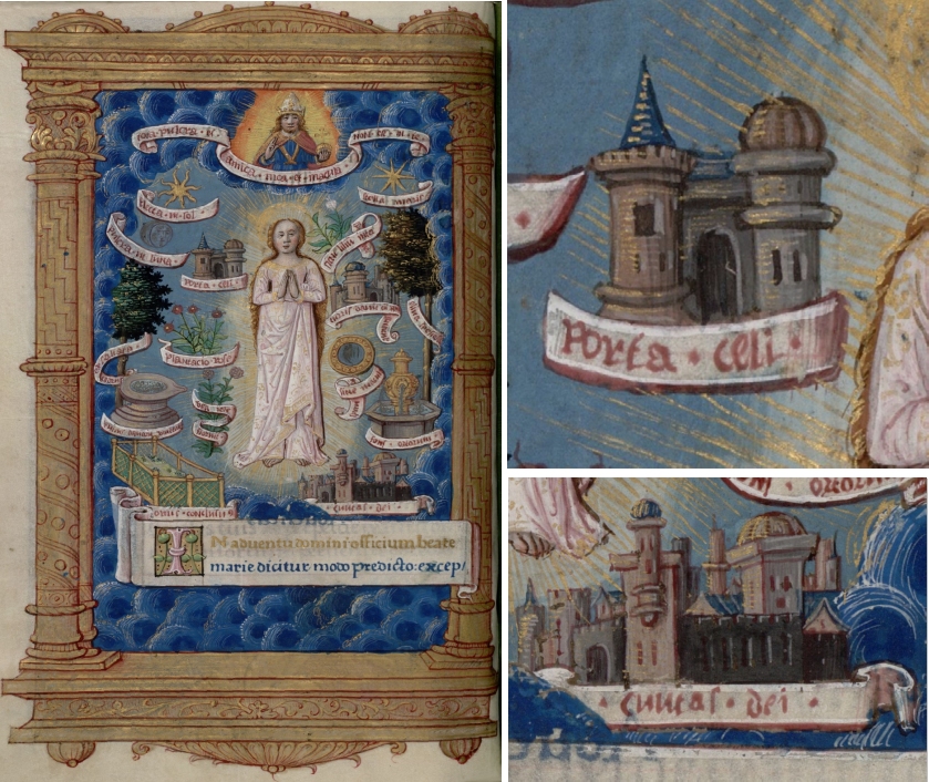 Die Miniatur auf fol. 91v mit einer Größe von 20 x 13 Zentimetern zeigt oben links die Porta Coeli, unten rechts die Civitas Dei. Beide Objekte sind mit vielgestaltig ausgeführt, Türmchen, Erker, Zinnen und Profilleisten sorgen für Abwechselung. Zusätzlich wurde immer wieder Gold eingesetzt, was im Dach- und Wandbereich dieser beiden Objekte einen besonderen Glanz erzeugt und der Arbeit auch materiell einen Wert verleiht. Üblicherweise sind die beiden Türme, zwischen welche die eigentliche Himmelspforte gesetzt ist, in der Frühzeit dieses Motivs annähernd symmetrisch angelegt (vgl. hierzu etwa MS Latin 1175 mit ganz ähnlichen blauen Kuppeln), hier jedoch nicht: Bereits die beiden Turmschafte sind verschieden, links findet sich ein spitzes Helmdach, rechts eine gedrungene Kuppel. Die manieristische Freude an der Vielgestaltigkeit wird dann bei der Civitas Dei ausgelebt, wo der unbekannte Miniaturist seine Fantasie und sein Können unter Beweis stellt.