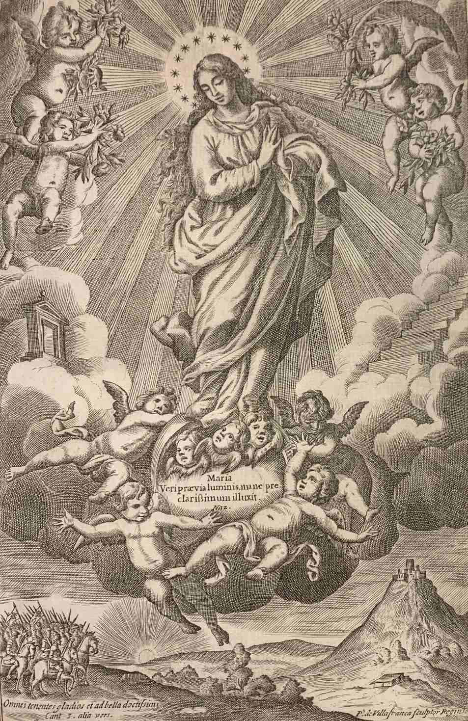 Bei diesem Kupferstich, der die Lauretanische Litanei zeigt, handelt es sich um eine Arbeit von de Villafranca – so ist es auf dem Frontispiz unten rechts in Latein angegeben. Man findet diesen Stich in der „Bullarium Ordinis Militiae de Alcantara“, welche von Ignacio José Ortega y Cotes, Pedro Ortega Zuñiga y Aranda und José Fernández de Brizuela 1759 in Madrid herausgebracht wurde. Kurz darauf, 1761, schmückt der gleiche Kupferstich auch das Werk „Bullarium ordinis militiae de Calatrava“.
