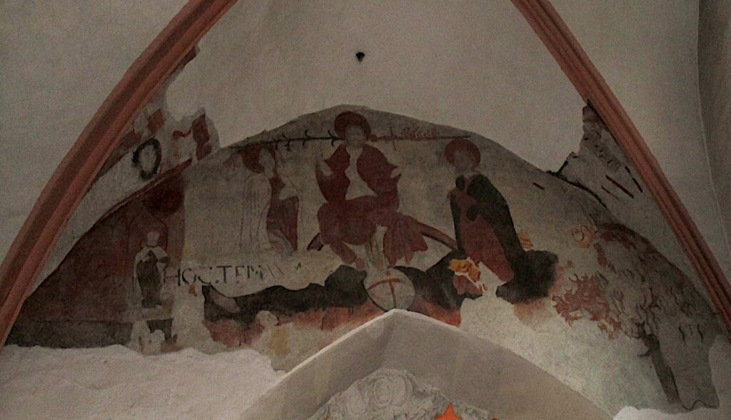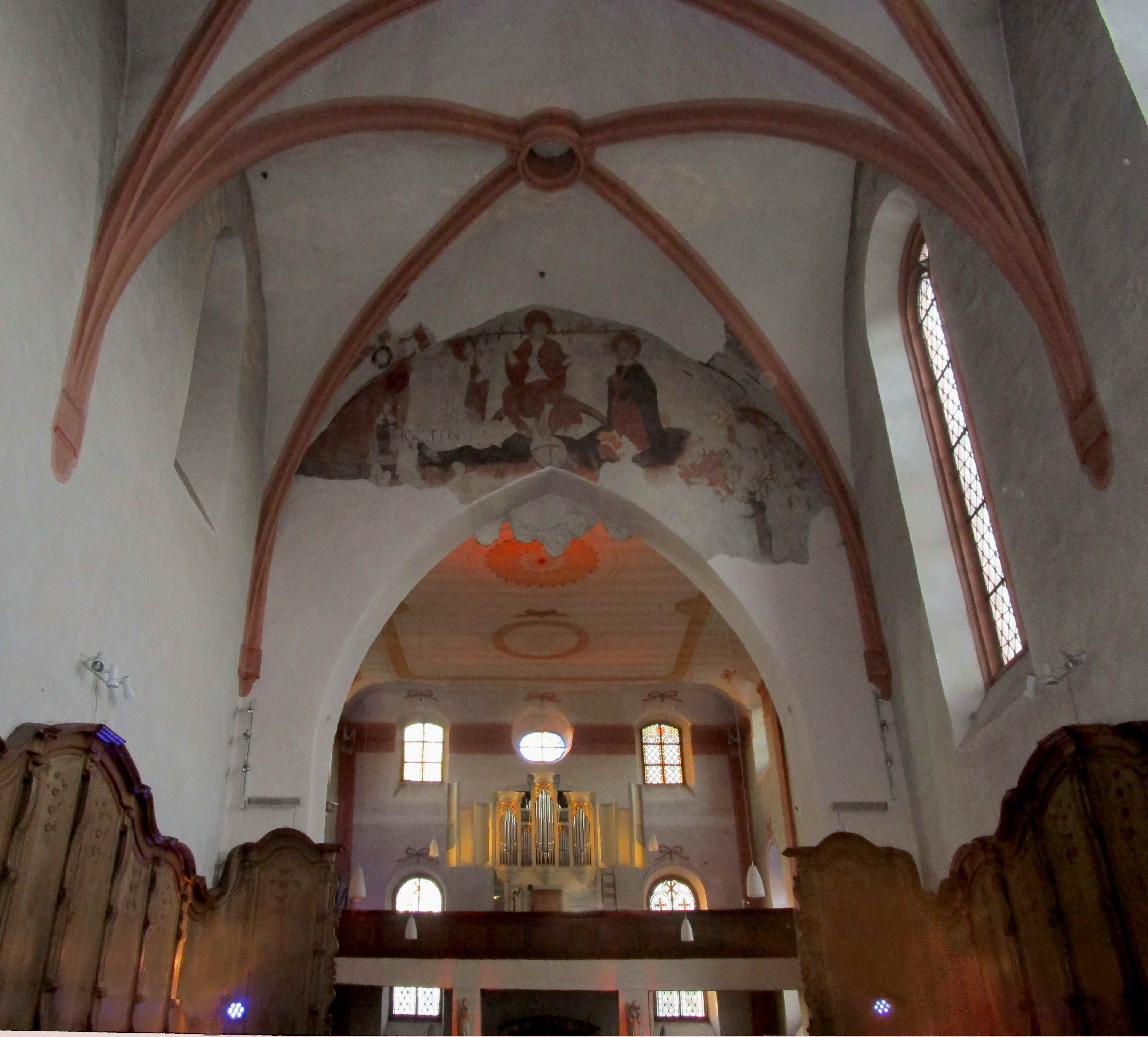 Eine weitere Besonderheit ist die Fortsetzung der Malereien nach oben. Anscheinend war zumindest auch die erste Kappe in der gleichen Art wie der Triumphbogen ausgemalt. Vermutlich waren dort Engel zu sehen, die die Arma Christi, die Leidenwerkzeuge von Christus präsentierten – darauf lassen nicht allein ähnliche Konzeptionen aus anderen Kirchen aus dem Spätmittelalter schließen, sondern auch die Dornenkrone, der sich im linken Zwickel erhalten hat.