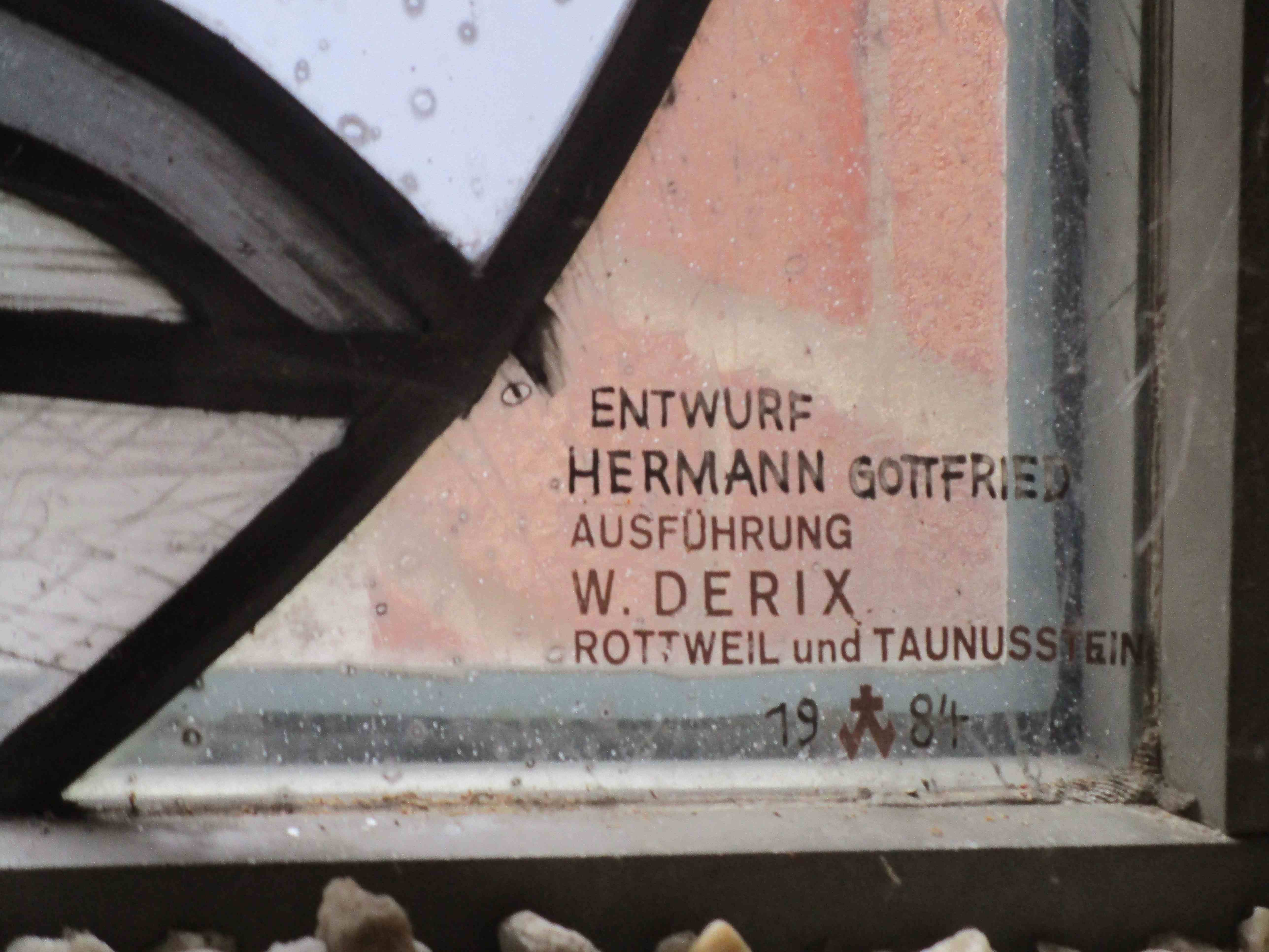 Dafür war ursprünglich Hildegard Bienen beauftragt, die den Auftrag jedoch wegen Erkrankung niederlegen musste. Das Bistum Fulda musste kurzfristig Ersatz finden, da der Bau Fortschritte machte und die Manufaktur, die die Verglasung einbauen sollte (Derix in Rottweil/Taunusstein) bereits feststand. Spontan konnte man den Glaskünstler Hermann Gottfried (1929-2015) gewinnen, der vor allem evangelische wie katholische Kirchen im Ruhrgebiet ausgestattet hat. In seinem Schaffen hat er zuvor schon mehrfach das Himmlische Jerusalem dargestellt, so in Duisburg-Laar (1962), Lohmar-Wahlscheid (1963), Herkenrath (1977) und Gronau (1980). Über diese Werke sind wir gut informiert, da der Künstler einen Teilnachlass dem Deutschen Glasmalerei-Museum in Linnich vermachte.