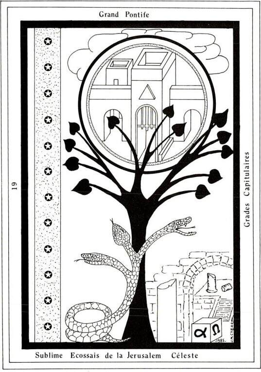 Über dem Baum mit zwölf Blättern in Herzform erscheint das Neue Jerusalem in einem Kreisnimbus. Drei Tore sind an der Vorderseite aneinander gesetzt, wobei das mittlere, etwas größere Tor ein Fallgitter trägt. Darüber ist ein Dreieck angebracht als Verweis auf die Trinität. Laut Cybart sind die christliche Symbole im Inneren des Menschen angelegt: „Beim Betrachten der Symbole erfährt der Wissende eine Läuterung durch die Erzählungen und Kräfte, die mit einem jeweiligen Symbol verbunden sind. Der zerstörte Tempel und das perfekte Jerusalem sind Auftrag an jeden Freimaurer, an seiner Weiterentwicklung und Vollkommenheit zu arbeiten. Das himmlische Jerusalem ist weniger Ziel, sondern vielmehr eine Bestimmung oder ein Antrieb, Ansporn, gemeinsam mit Gleichgesinnten an dem Höheren zu arbeiten. Unten ist Stein, Menschenwerk, oben Feinstoffliches, Gotteswerk“ (Cybart 2002).