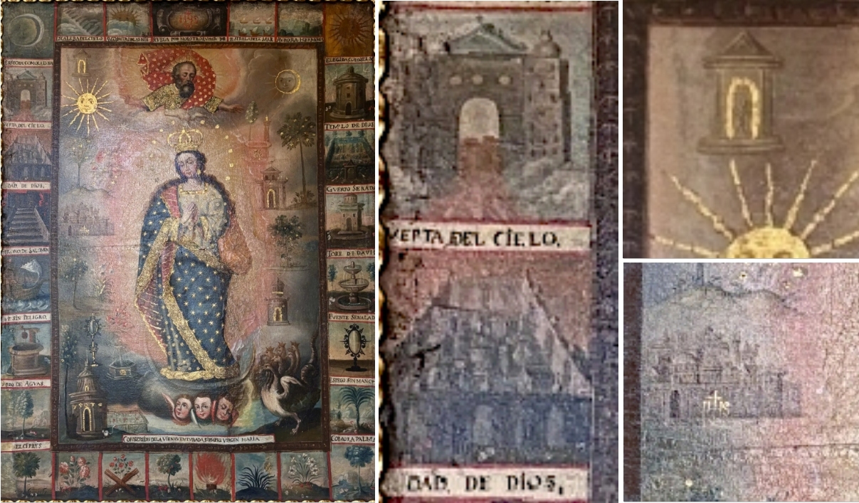 Was das Himmlische Jerusalem angeht, ist dieses Malerei eine interessante Fassung, deren Anlage, geschweige denn Aussage, man erst Stück für Stück zu fassen vermag. Im mittleren Bildfeld erscheint eine exzellent ausgearbeitete Madonna im blau-roten Sternengewand, die auf einer Mondsichel schwebt. Um sie sind fast zwanzig ihrer Symbole gelegt, alle mit Gold akzentuiert. Allein das mehrköpfige Fabelwesen in der Ecke rechts unten (vgl. Johann Georg Tibianus) ist ohne Gold: Hier handelt es sich nicht um ein Mariensymbol, sondern um den Drachen, der meist direkt unter den Füßen Mariens positioniert ist . Die lateinischen Beschriftungen, die ansonsten solche Malereien erklären, fehlen hier, wir werden später verstehen, warum. In der Ecke links oben befindet sich die Himmelspforte mit einem vergoldeten Tor. Drei Symbole unter ihr steht die Gottesstadt, eine leider kaum sichtbare Konglomeration von Bauten hinter einer Stadtmauer. Die Mauer hat links einen einfachen Zugang, und rechts stehen die vergoldeten Buchstaben IHS mit einem aufgesetztem Kreuz, also das Nomen sacrum, welches in sich den Namen Jesu trägt. Eine solche Aufschrift ist mir bei der Civitas Dei von keiner anderen neuspanischen Malerei der gesamten Frühen Neuzeit bekannt.