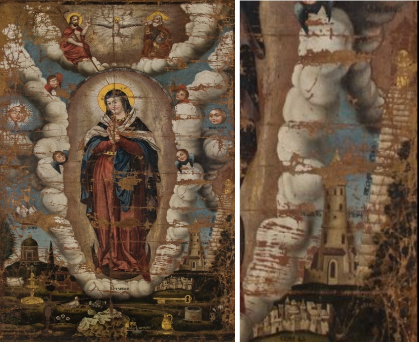 Leider ist die Malerei stark zerstört, könnte aber noch vollständig rekonstruiert werden. Folgendes kann festgehalten werden: Die Vorlagen zu diesem Werk liegen in der französischen und spanischen Malerei des 16. und 17. Jahrhunderts. Vom Aufbau zählt dieses Gemälde zu den U-Madonnen-Malereien, die man im 17. Jahrhundert in Frankreich, Italien wie auch Spanien finden kann. Was die Symbole Mariens angeht, wurden sie in großer Zahl in das Bild gesetzt, vor allem im unteren Bereich zu einer Landschaft zusammengefügt – neu oder innovativ war dies keineswegs, man findet Ähnliches bereist bei Pieter Claissens. Hier, bei Jonathan, wurden die Symbole, die das Neue Jerusalem symbolisieren, rechts unten in Beziehung gesetzt: Eine Ansammlung weißer Bauten hinter einer vor- und zurückspringen Mauer markiert die Civitas Dei – so steht es auch in Armenisch unter dem Symbol. Rechts der Stadt führt eine steile Treppe nach oben, zur Himmelspforte. Hier ist die Zerstörung besonders schwer, aber man sieht noch die goldene Füllung in einer braunen klassischen Pforte – man kennt solches aus einer Darstellung aus der Kirche San Miguel de Boconó in Trujillo (um 1620) oder von Gregorio Gamarra (um 1625), dem wahrscheinlichen Vorbild von Jonathan.