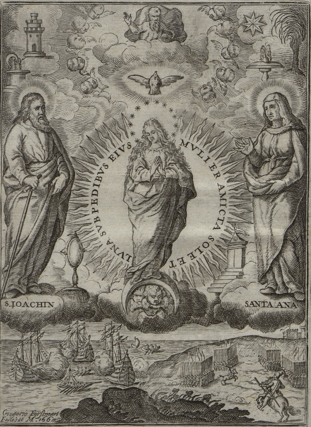 Die Illustration vereint unten zwei für Spanien wichtige Marienerscheinungen: Links die Erscheinung bei der Seeschlacht von Lepanto (1571) und rechts die Erscheinung bei der Schlacht von Covadonga (722). Unten links ist der Kupferstich wie folgt unterschrieben „Gregorio Forstman faciebat M. 1660“. Über diesen Künstler Forstman ist nicht viel bekannt – dem Namen nach könnte er irische oder englische Wurzeln gehabt haben. Seine Werkstatt führte er in der andalusischen Stadt Medina-Sidonia, nachgewiesen ist er für den Zeitraum von 1653 bis 1713.