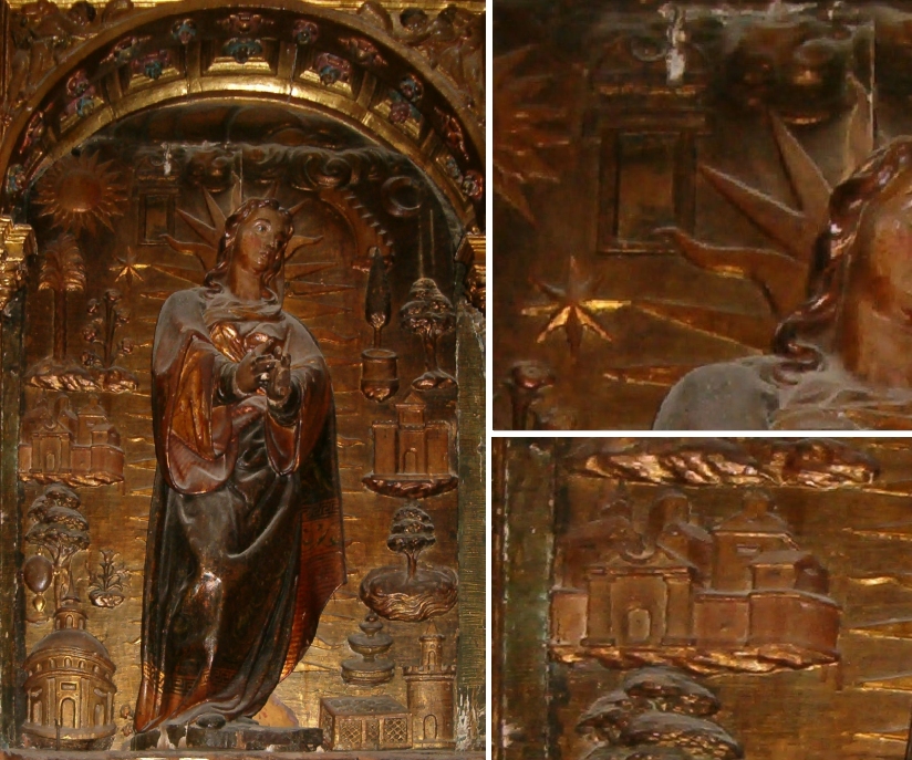 Das Detail, welches hier interessiert, befindet sich am linken Seitenflügel in der untersten Reihe von insgesamt fünf Reihen oder Ebenen. Es handelt sich um eine traditionelle Darstellung der Tota Pulchra, wie sie in Spanien seit Pedro Diaz bekannt war. Im Zentrum befindet sich eine Marienfigur, die allerdings keines ihrer erkennbaren Merkmale aufweist, wie den Sternenmantel, die Krone, die Mondsichel oder den zertretenden Drachen – mit den Gesichtszügen könnte man bei der Figur durchaus an Johannes denken. Der Zusammenhang wird erst durch die Symbole im Hintergrund deutlich. Ganz oben neben der Sonne befindet sich eine einfache Himmelspforte, mittig links die Gottesstadt. Dort findet sich eine Pforte mit einem Renaissance-Sprenggiebel, mit dem auch die Himmelspforte geschmückt ist. Die Stadt schwebt auf einem kleinen Wolkenband, den fast alle übrigen Symbole besitzen, nicht jedoch die Himmelspforte – ob damit etwas angedeutet sein soll, vermag ich nicht zu sagen, möglicherweise wurde das Wolkenband übersehen. Durch die einheitliche Vergoldung treten die Symbole nicht besonders hervor, auch auf die erklärende Beschriftung hat Miguel Valles verzichtet – im erhöhten und abgegrenzten Altarbereich waren diese Details für die Masse der Besucher ohnehin nicht sichtbar.