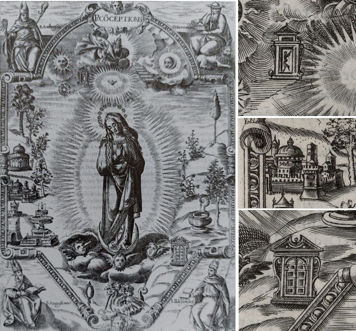 Doch auch die Qualität des Kupferstichs weist auf Cort hin. In beiden Stichen sind die Positionen der Symbole Marias identisch, mit einem kleinen Unterschied: 1587 wurde auf die lateinischen Bezeichnungen verzichtet. Vor allem die beiden Pforten sind eins zu eins gleich, sogar die menschliche Figur (eindeutig kein Engelswesen, sondern ein typisch humanistisches Statement bezüglich der Bedeutung des Menschen) findet sich in der Porta Coeli. Bei der Civitas Dei ist 1587 die Zugangpforte stärker vom Rand beschnitten, daher kann man über ihre stilistische Gestaltung wenig sagen. In der Stadt findet sich aber auch der ruinöse Geschlechterturm, der bereits in der 1567er-Fassung irritiert. Wieder einmal haben wir also ein Ruinen-Jerusalem in Dürer-Tradition. Ansonsten zieht sich 1587 ein Eierstab als Rahmen um die Symbole, der sich oben zu einem Bogen formt, wo der Titel „P. Coceptionis“ eingefügt ist. Auch unten springt der Rahmen zurück, so dass in allen vier Ecken Platz ist, der mit vier Kirchenvätern besetzt wurde.