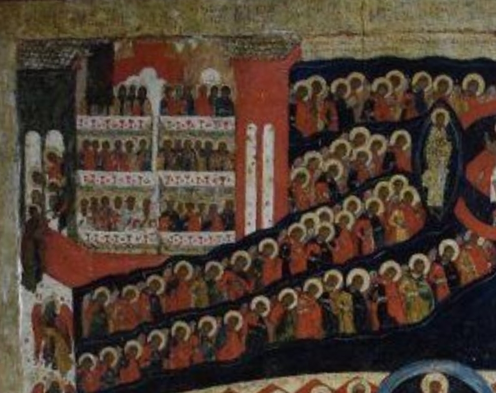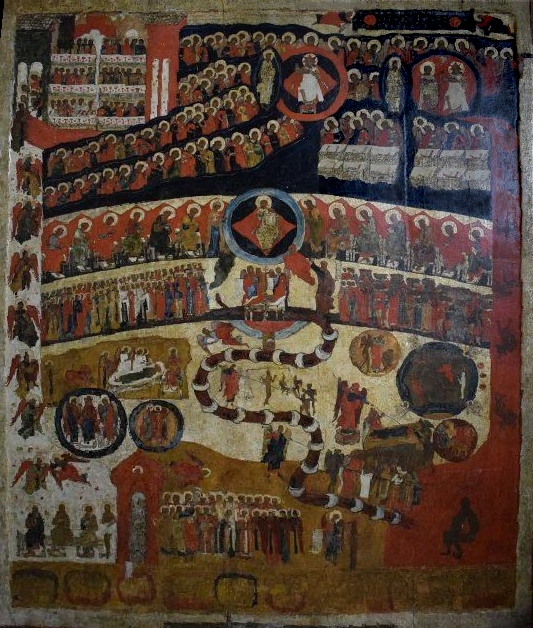 Den Aufbau dieser Ikone darf man als „klassisch“ bezeichnen, in Kürze: Christus in der der Mitte in einer runden Mandorla, von Engeln und Heiligen umgeben, die in langen Reihen geordnet sind. Links unten befindet sich das Paradies mit der ersten Pforte, recht die rot glühende Hölle. Von dort bewegt sich eine Schlange, die das Böse symbolisiert, nach oben. Ebenfalls nach oben werden links Seelen von Engeln wie in einem Fahrstuhl nach oben gebracht. Dort schließlich wartet das Himmlische Jerusalem mit der zweiten Pforte.