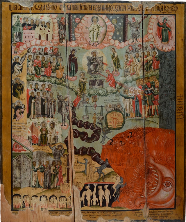 Diese russische Weltgerichtsikone befindet sich heute in der Sammlung des Museum-Reservats Pereslavl. Pereslavl gehört zum sogenannten „Goldenen Ring“ nordöstlich von Moskau mit zahlreichen historischen Klosteranlagen und Kirchen mit einem heute noch beachtlichen Bestand an Ikonen. Diese mit dem Motiv des Weltgerichts soll aus dem 18. Jahrhundert stammen, als die bildlichen Elemente dieses Themas längst feststanden. Auch das Himmlische Jerusalem als Aneinanderreihung in Form und Farbe unterschiedlicher Architekturlemente mit einer Pforte und einem Wolkenband war bereits etabliert, das zeigt ein Blick auf die Weltgerichtsikone der Tretjakow-Galerie (16. Jh.), die Weltgerichtsikone aus dem Louvre (1650-1700) oder diejenige aus der Mironositskaya Kirche in Vologda (um 1675).