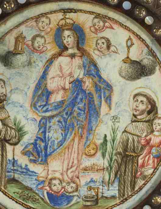 Bei einem späteren Werk aus der zweiten Hälfte des 17. Jahrhunderts wird die Maria Immaculata zusammen mit Antonius von Padua und dem heiligen Franz von Assisi gezeigt – offensichtlich ein Nonnenabzeichen mit einer Verbindung zum Franziskanerorden aus dem Gebiet des heutigen Mexiko, wo es herstammt. Die kostbare Arbeit entspricht kaum monastischer Schlichtheit dieses Ordens, sie basiert auf Buntstift, Gouache auf Pergament und hat zusätzlich mit einem Rahmen aus Schildpatt, Perlmutt und Messing. 2013 kam das Kunstwerk als Schenkung der Sammlung von Frederick und Jan Mayer in das Kunstmuseum von Denver. Oben links, im neuspanischen Kolonialstil, schwebt auf einer Wolke eine offene, barocke Himmelspforte. Und nicht nur das: Auf diesem Beispiel findet man unten rechts auch einmal die Stadt Gottes, als Agglomeration bräunlicher eng aneinander gesetzter Bauten über einem Streifen Stadtmauer.