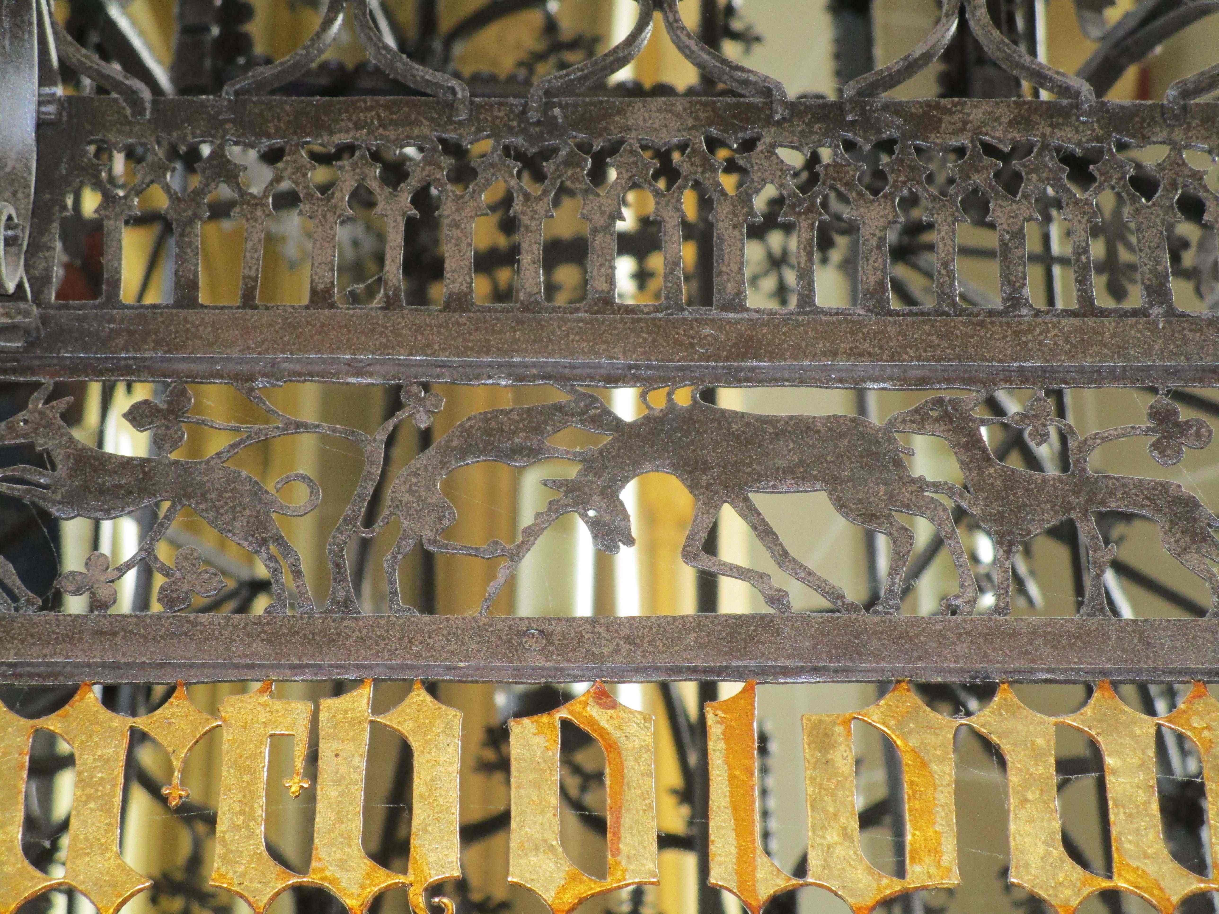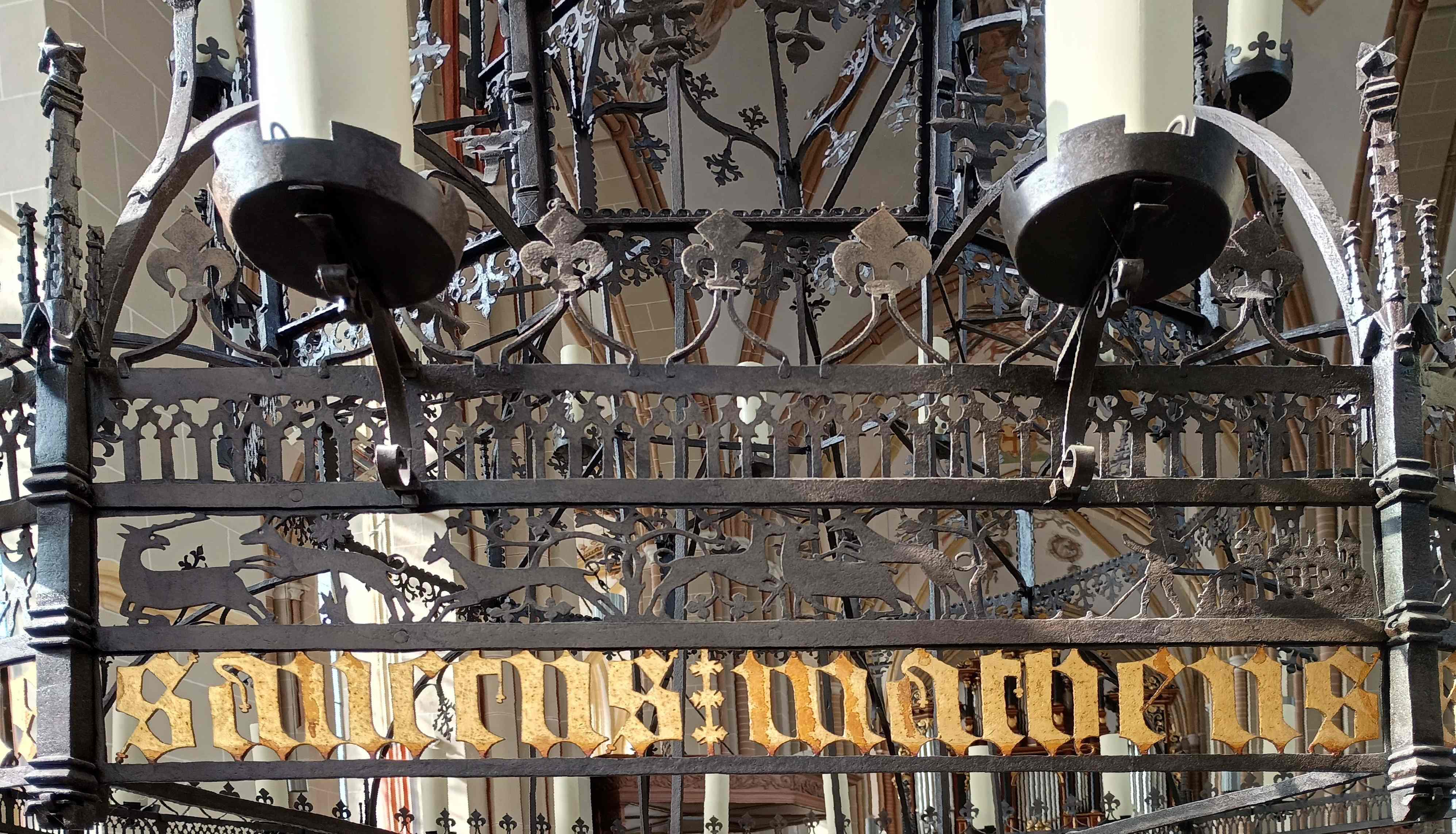 Es folgt das letzte Band, eine Reihung eines geometrischen Musters, welches an Tore oder Arkaden erinnert. Auf dem Reif wurden oben schmiedeeiserne Lilien gesetzt. Dort findet sich eine erste Reihe von Kerzen, jeweils zwei an jeder Seite, insgesamt also 24. Weitere zwölf Kerzen finden sich in einem zweiten, kleineren Reif darüber. Hoch oben, nach fast zweieinhalb Metern, endet der Leuchter in einer letzten, dritten Krone. In diese sind 30 kleine Füchse damit beschäftigt, Trauben zu stehlen – ein humoristisches Motiv, welches wegen Kleinheiligkeit und Entfernung allerdings von unten nicht gesehen werden kann.