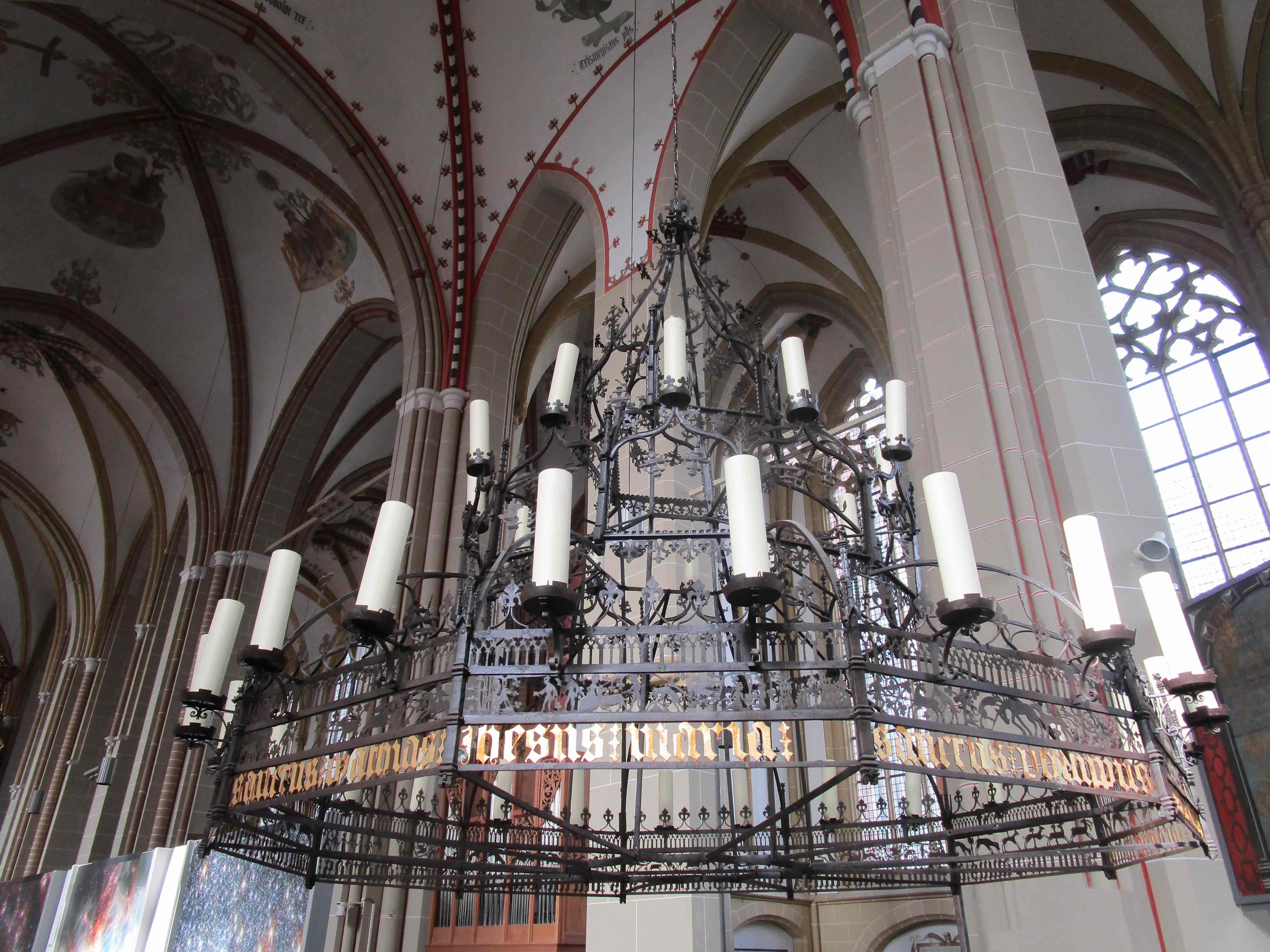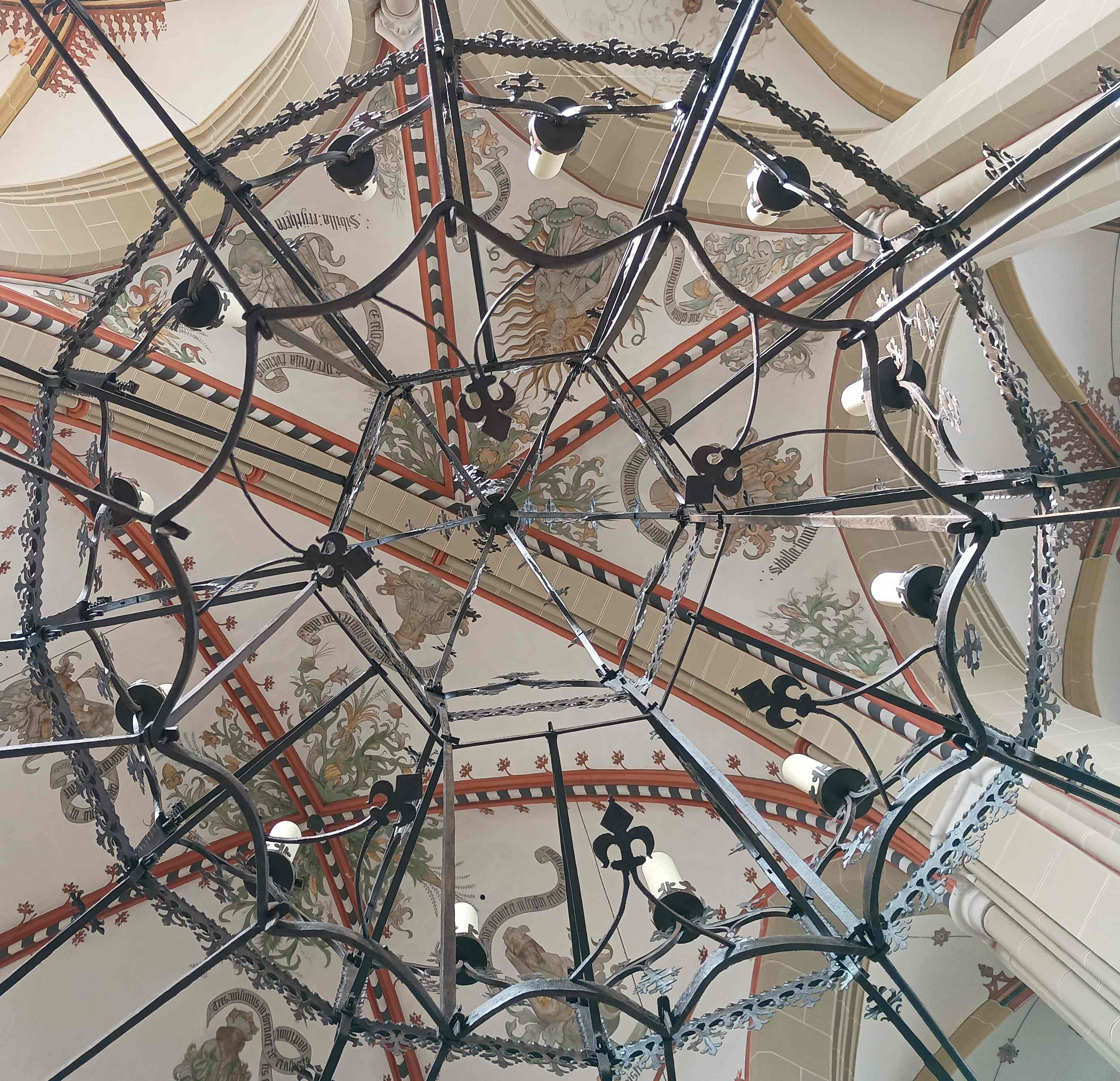 Die Maße des Leuchters sind beeindruckend: Die Krone ist 2,70 Meter breit, 2,37 Meter hoch und das Schmiedeeisen wiegt 260 Kilogramm. Mit diesem Umfang war er von Beginn an zur Beleuchtung der gotischen Kirche vorgesehen, die heute auch als Museum dient. Aus Brandschutzgründen werden die Kerzen heute nicht mehr entzündet, so dass man eigentlich von dem Kunstobjekt in Funktion nur einen ungefähren Eindruck bekommen kann. Doch selbst bei Tageslicht dominiert der Leuchter nach dem Kreuzungspunkt von Haupt- und Querschiff unmittelbar vor dem Chorbereich und dem Marienaltar, um dort vor allem die Hostie bei der Messe gut sichtbar zu machen.