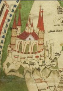 Es gibt gute Gründe, diese Stadtdarstellung als Himmlisches Jerusalem anzusehen. Das sind an erster Stelle die drei gewaltigen Rundbogentore an der Frontseite zum Betrachter hin. An den Seiten erheben sich in den Ecken runde Türme.